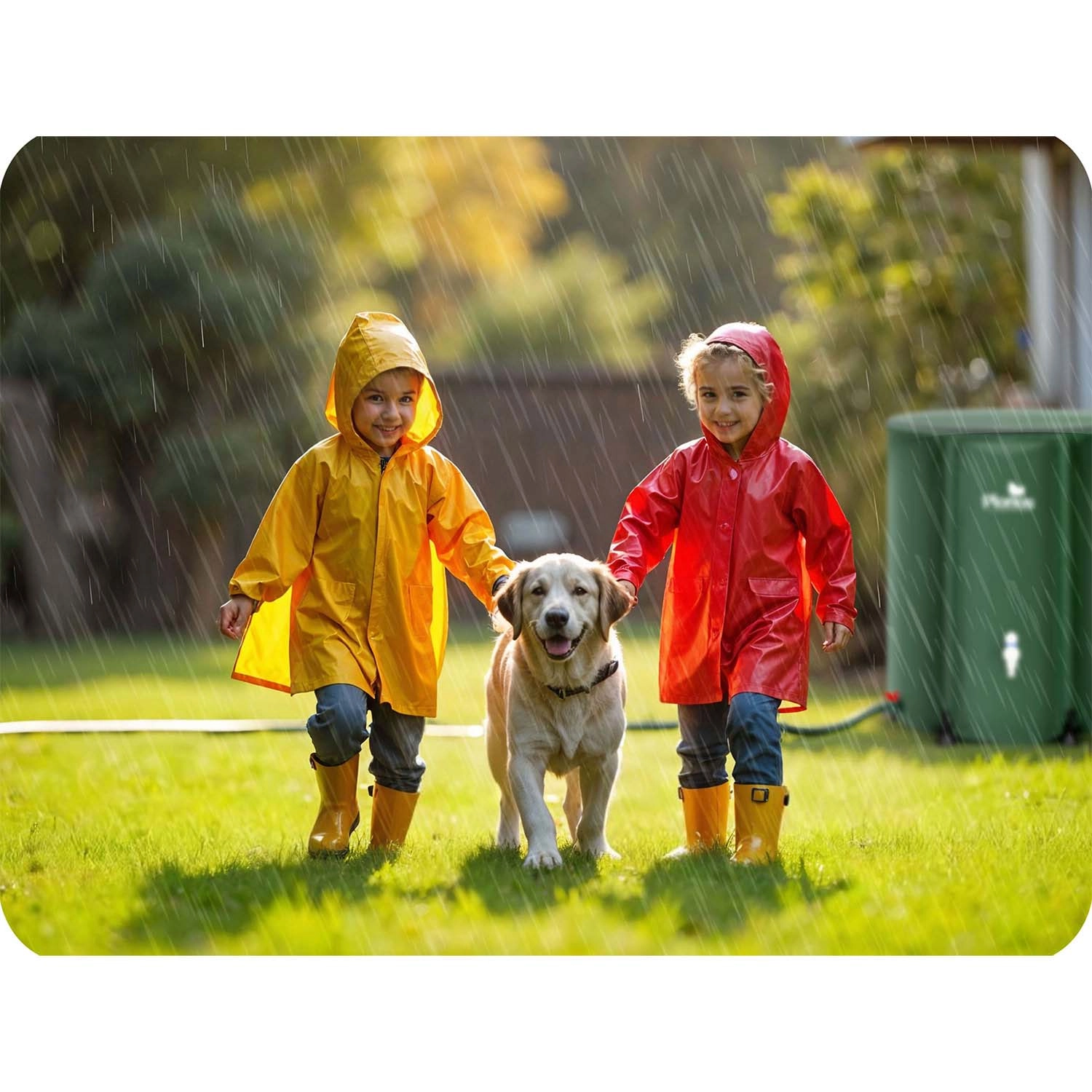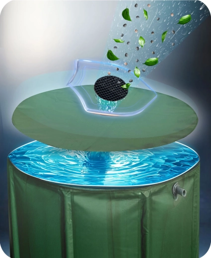 Horní kryt se vstupem pro srážky a integrované sítko zachytí listí a nečistoty. Voda zůstává čirá a připravená k okamžitému použití na zahradě.