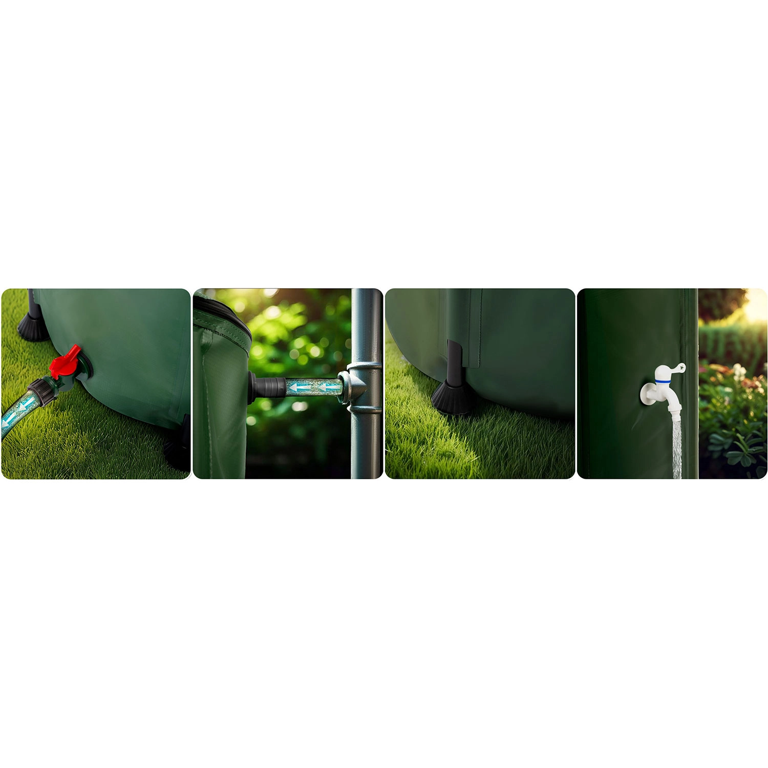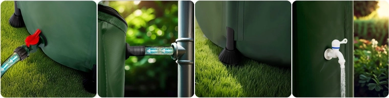 Praktické ovládací prvky umožňují pohodlné používání: přední kohout s páčkou on/off pro rychlé naplnění konve a spodní vypouštěcí/odtokový ventil pro napojení hadice a efektivní distribuci vody po celé zahradě. Složený sud zabere minimum místa, takže je skvělý i pro menší zahrady a sezónní uskladnění.