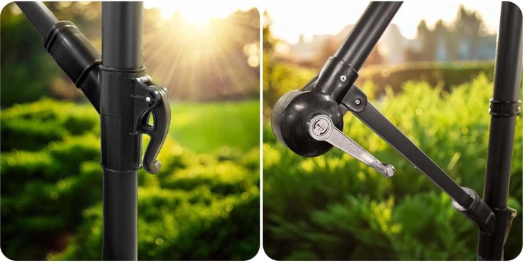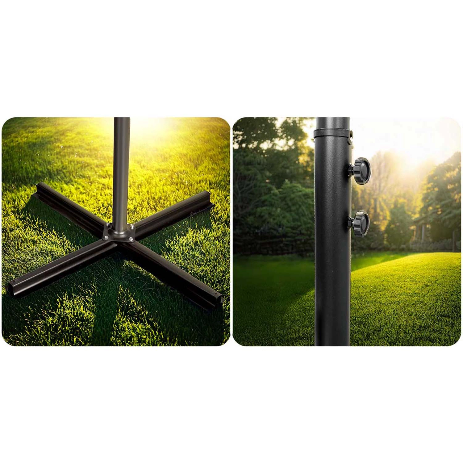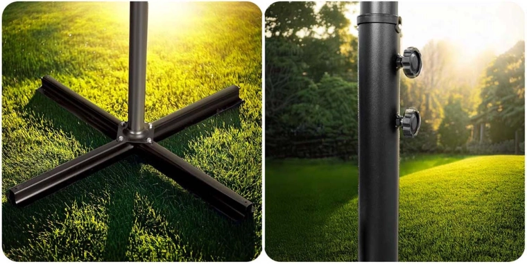 Stabilní konstrukce se 6-segmentovou střechou, ocelovým rámem a křížovou základnou poskytuje jistotu i při poryvech větru. Intuitivní mechanismus umožňuje rychlé rozložení a složení, stejně jako snadnou regulaci výšky a sklonu, aby byl stín vždy tam, kde ho potřebujete. Praktický ochranný obal z materiálu Oxford s zipem a stahováním brání blednutí a chrání před povětrností.