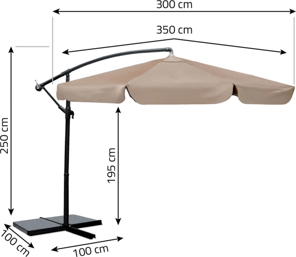 - Velký stín bez překážek díky bočnímu ramenu a průměru 3 m (3,5 m po látce)
