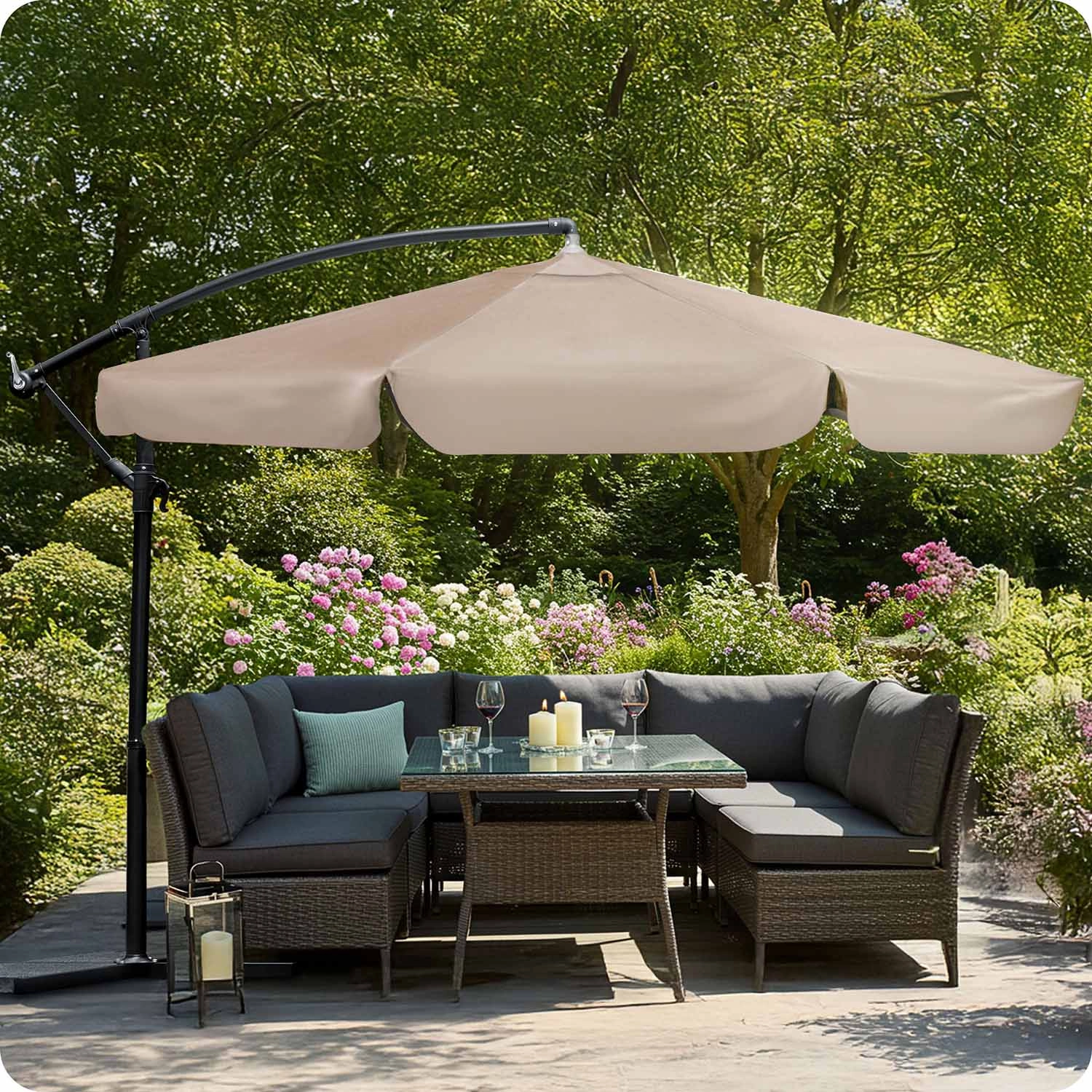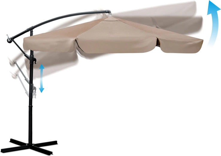 Boční konstrukce uvolňuje prostor pod slunečníkem – ideální nad jídelní stůl, sedačku nebo lehátka. Průměr 3 m poskytne příjemný chládek i pro početnější sezení.