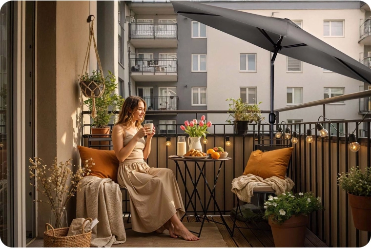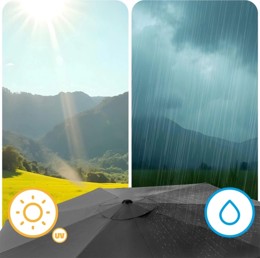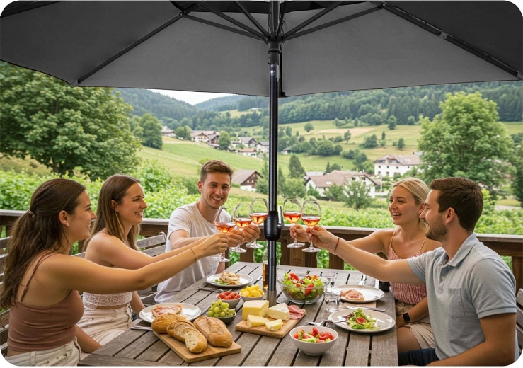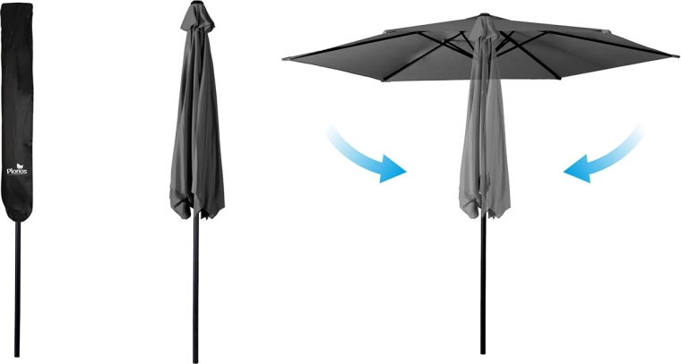 Ocelový stožár a 6 pevných žeber poskytují pevnost a odolnost. Ideální pro terasy, balkony i zahradní posezení.
