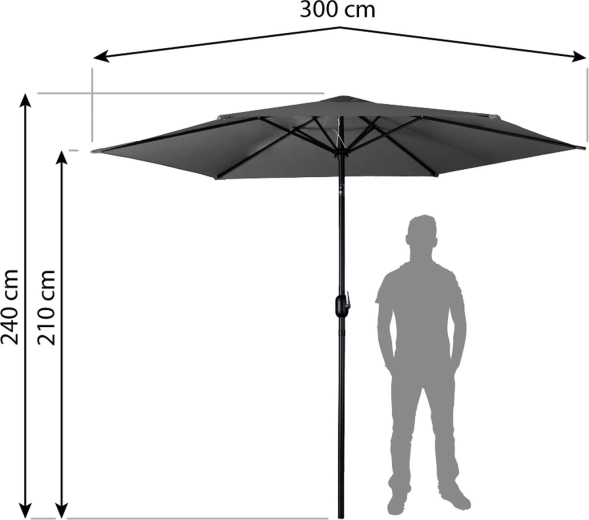 Tento velký zahradní slunečník s průměrem 3 m poskytne spolehlivý stín pro jídelní stůl, posezení i lehátka. Pevná ocelová konstrukce a 6 žeber drží tvar i při větru, zatímco hustě tkaný polyester 160 g/m² je odolný a snadno se udržuje. Praktický větrací otvor na vrcholu zlepšuje proudění vzduchu a pomáhá snižovat tlak větru.