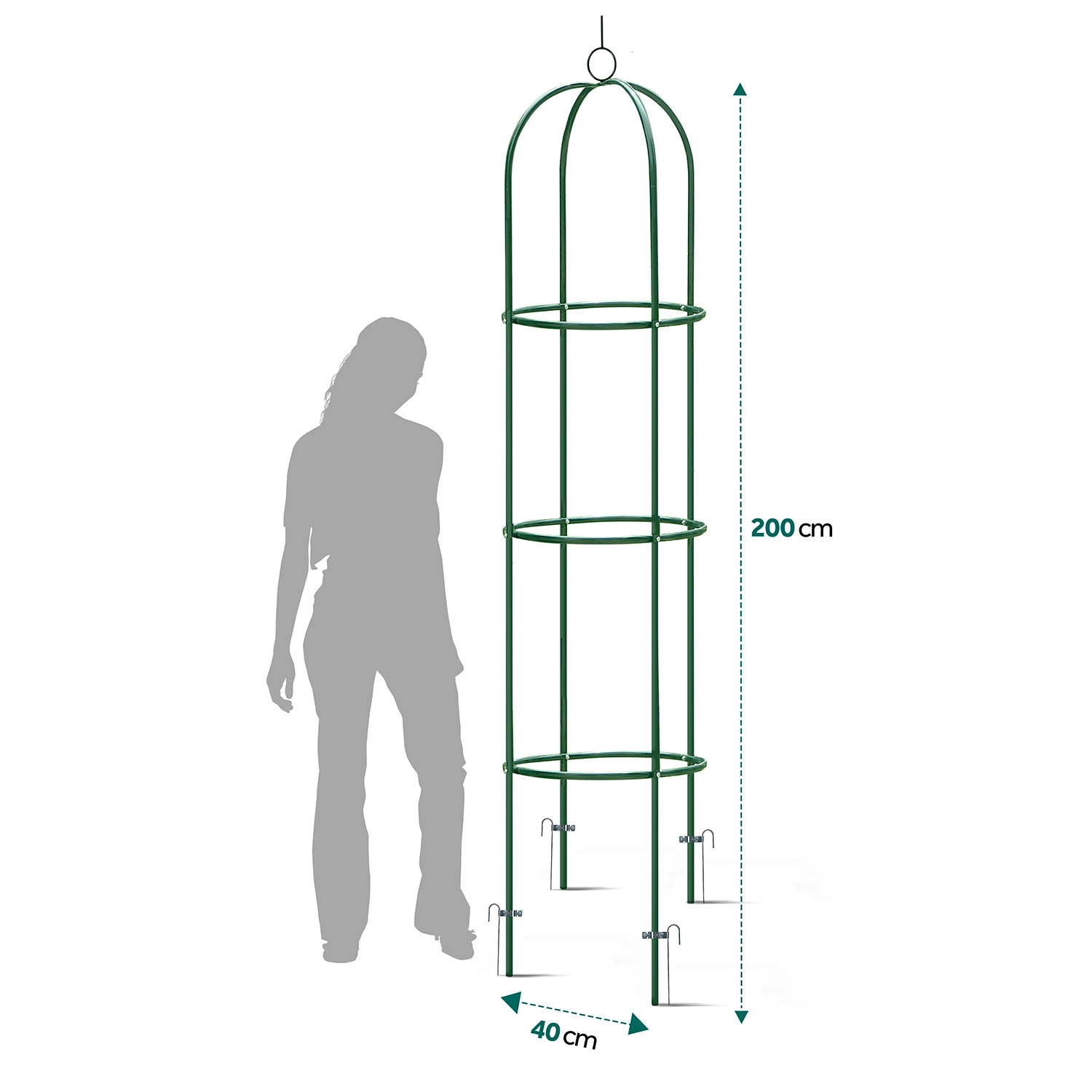 Montáž je rychlá a intuitivní – zvládnete ji bez speciálního nářadí, s pomocí přiloženého spojovacího materiálu a přehledného návodu. Kompaktní půdorys 40 × 40 cm se hodí jak do záhonů, tak i do velkých květináčů na terase či u vchodu. Tmavě zelená barva přirozeně ladí s listím a květy a zvýrazňuje růže, plamének, vistárii i okrasné fazole.