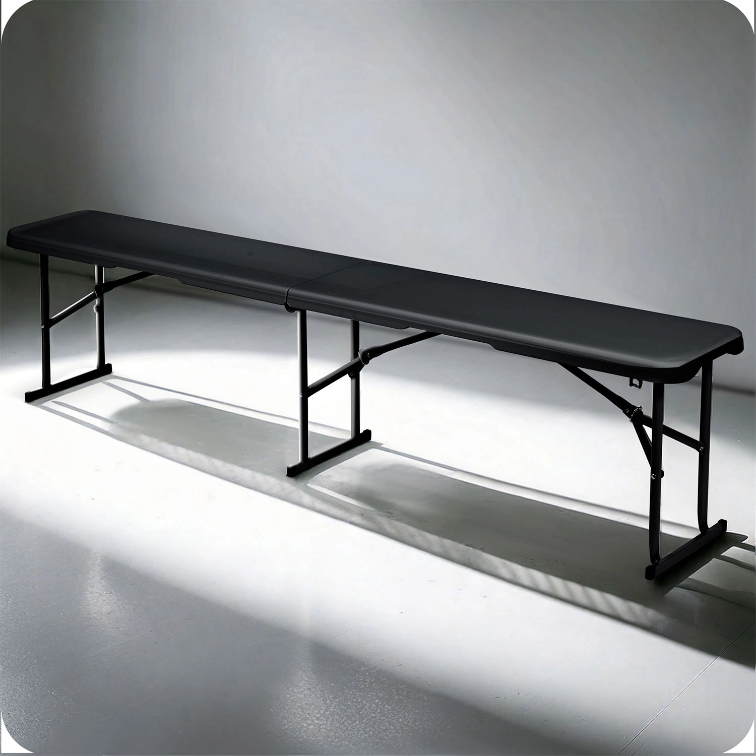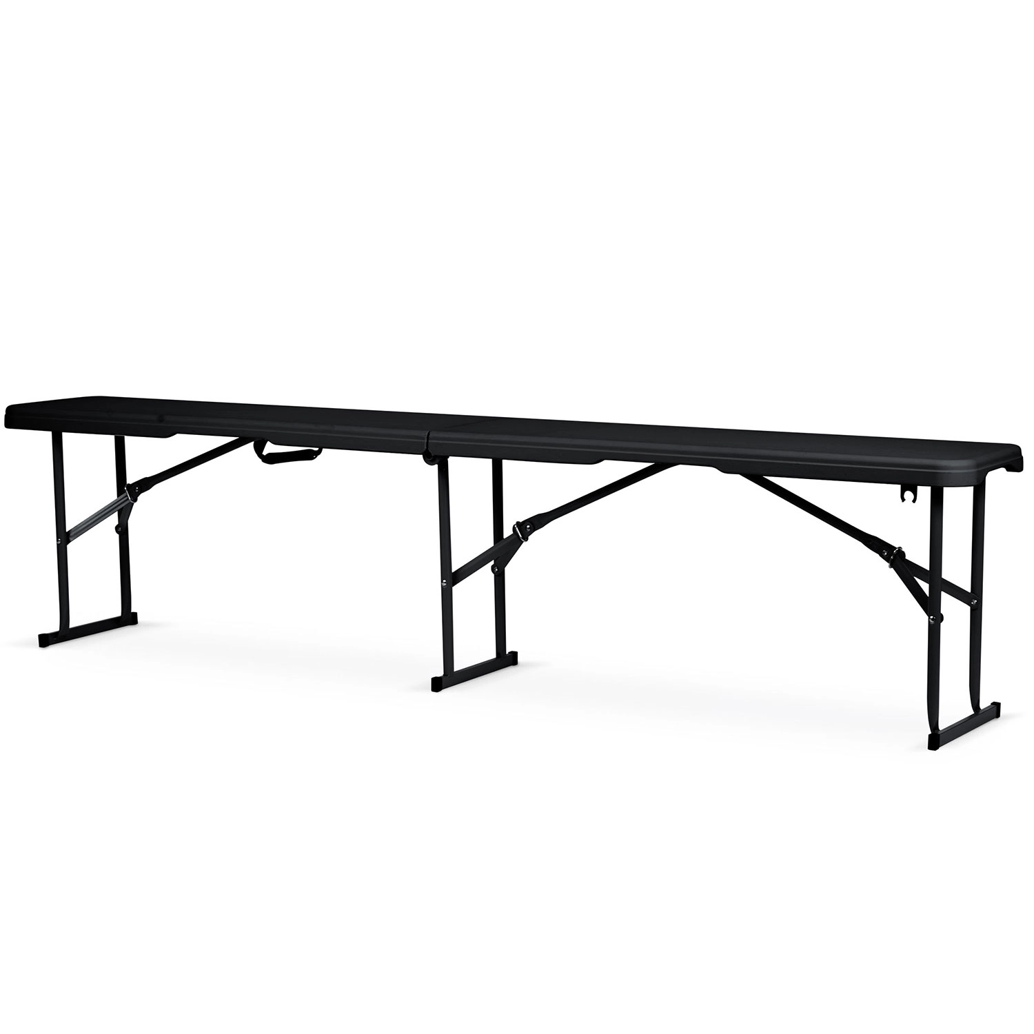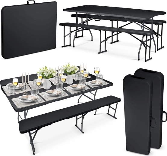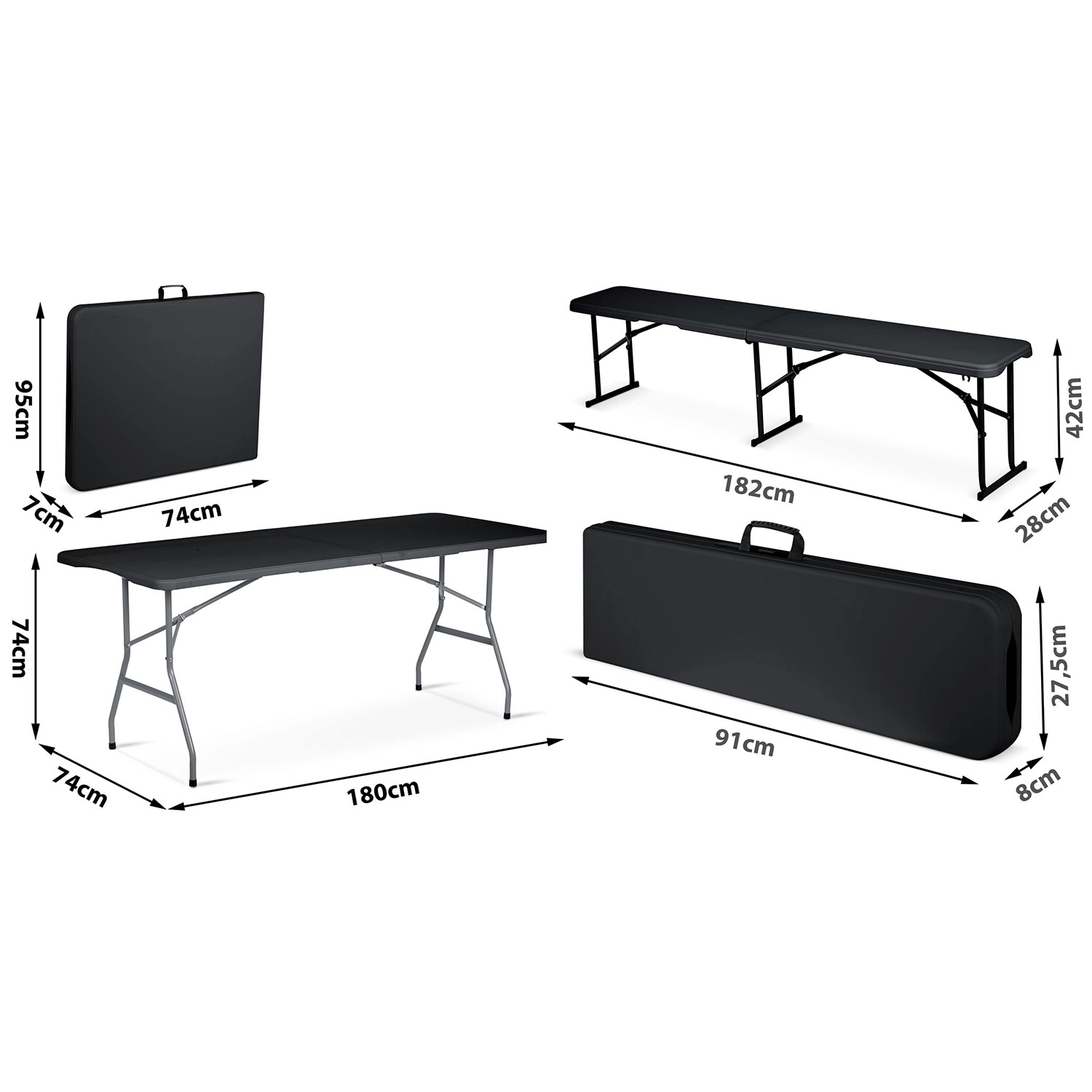 Praktický skládací cateringový set se skládá z jednoho stolu a dvou lavic v délce 180 cm v elegantní černé barvě. Ideální na zahradu, terasu i akce. Nabízí pevnou ocelovou konstrukci s práškovým lakem, voděodolný a snadno omyvatelný PE povrch, rychlé rozložení a složení a pohodlné přenášení díky integrované rukojeti.