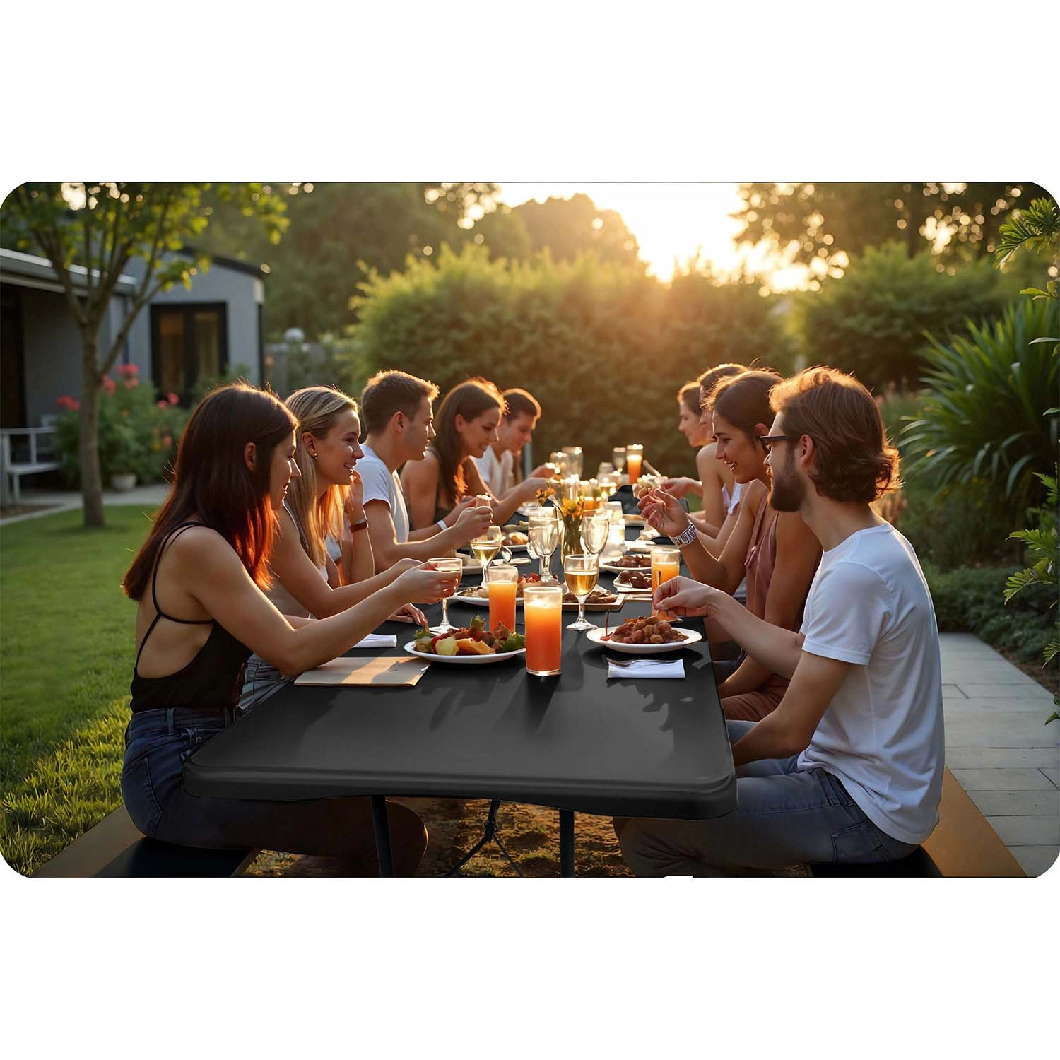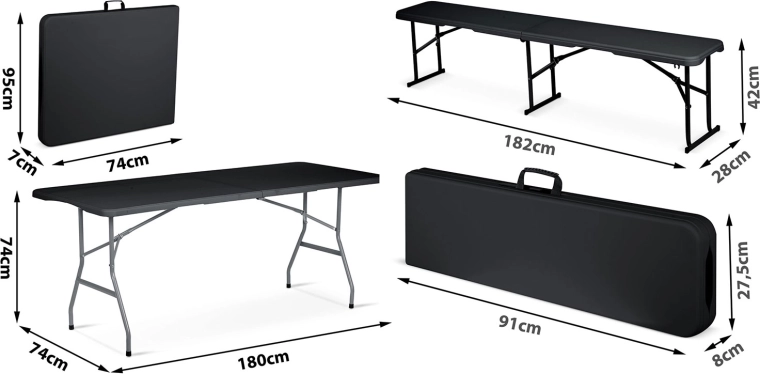 Tento odolný skládací set je skvělou volbou pro garden party, rodinné oslavy i profesionální catering. Deska z PE s ochranou proti UV záření je odolná vůči vodě, skvrnám a poškrábání, zatímco ocelový rám s práškovým nástřikem poskytuje stabilitu a dlouhou životnost. Po složení set zabere minimum místa a díky rukojeti jej snadno přenesete.