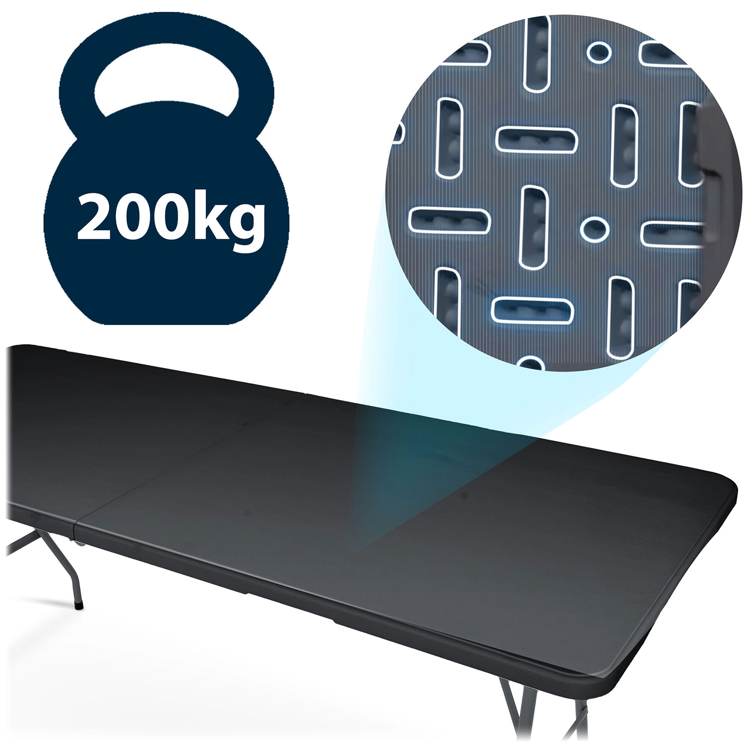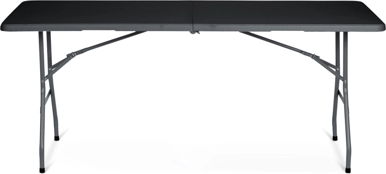 Stůl jednoduše rozložíte a zajistíte. Protiskluzové koncovky nohou chrání podlahu a zvyšují stabilitu, zpevňující výztuhy a západky drží vše na místě. Po akci jej během chvilky složíte napůl a uložíte i do menšího prostoru.