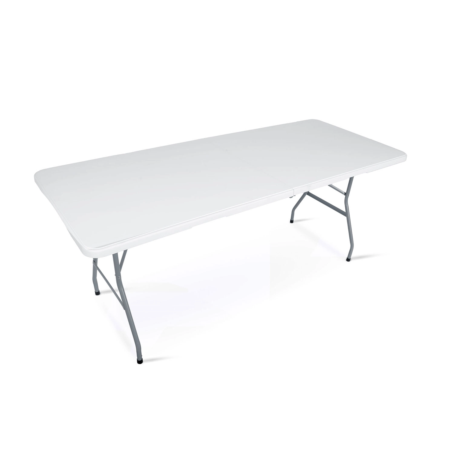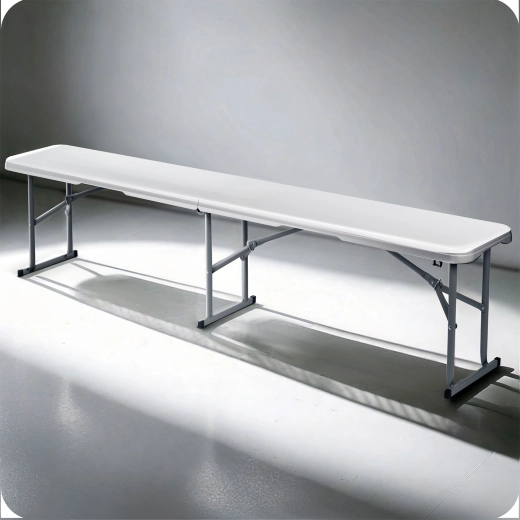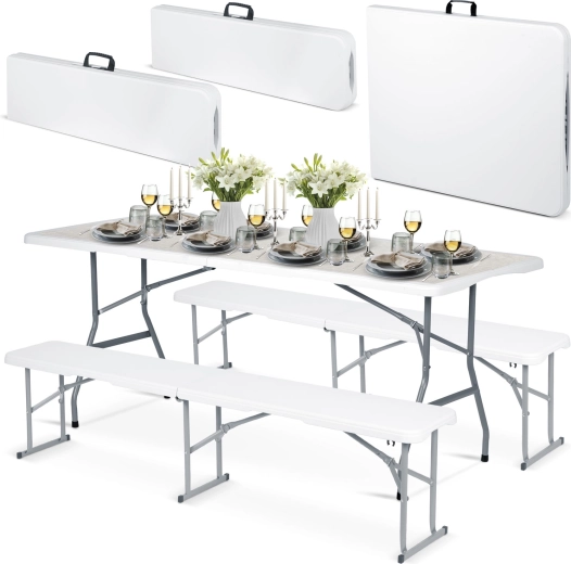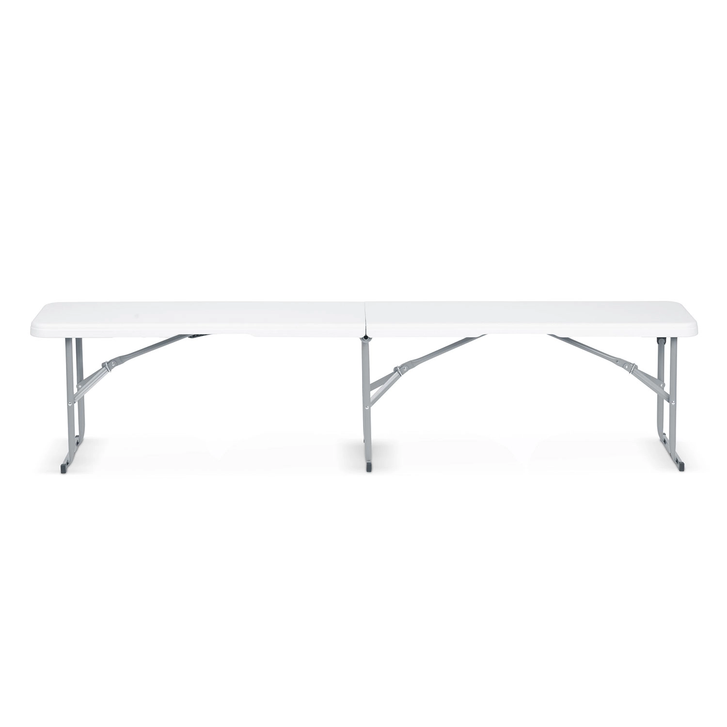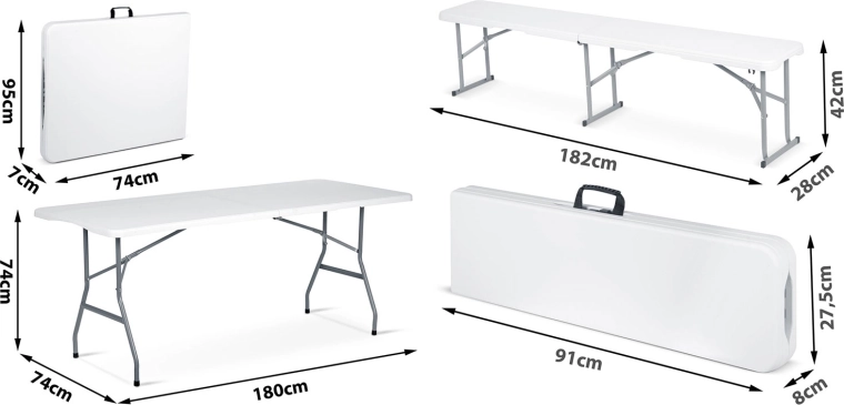 Praktická skládací sada pro zahradu i akce: 1x stůl a 2x lavice s délkou 180 cm v elegantní bílé barvě. Nabízí pevnou ocelovou konstrukci, voděodolný a snadno omyvatelný povrch, UV odolnost a komfortní přenášení díky integrované rukojeti. Ideální pro oslavy, pikniky, zahradní party i rodinné sešlosti.