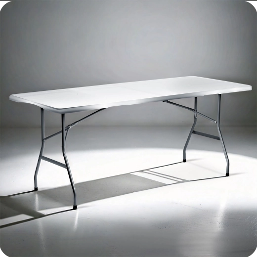 Tato skládací cateringová sada kombinuje odolnost, stabilitu a rychlou obsluhu. Plastový povrch z PE je voděodolný, odolný vůči UV záření i skvrnám, takže se skvěle hodí do exteriéru i interiéru. Práškově lakovaný ocelový rám s křížovým vyztužením zajišťuje spolehlivou stabilitu, zatímco gumové koncovky nohou chrání podlahu.