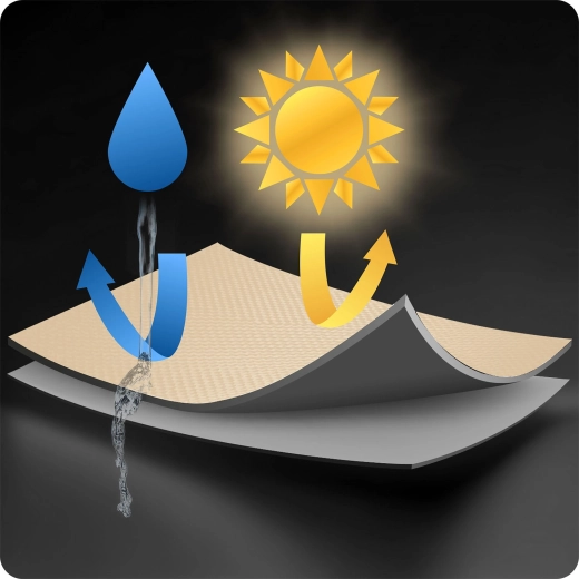 - Vodoodpudivý PE 180 g/m² – ochrana před UV zářením i lehkým deštěm.