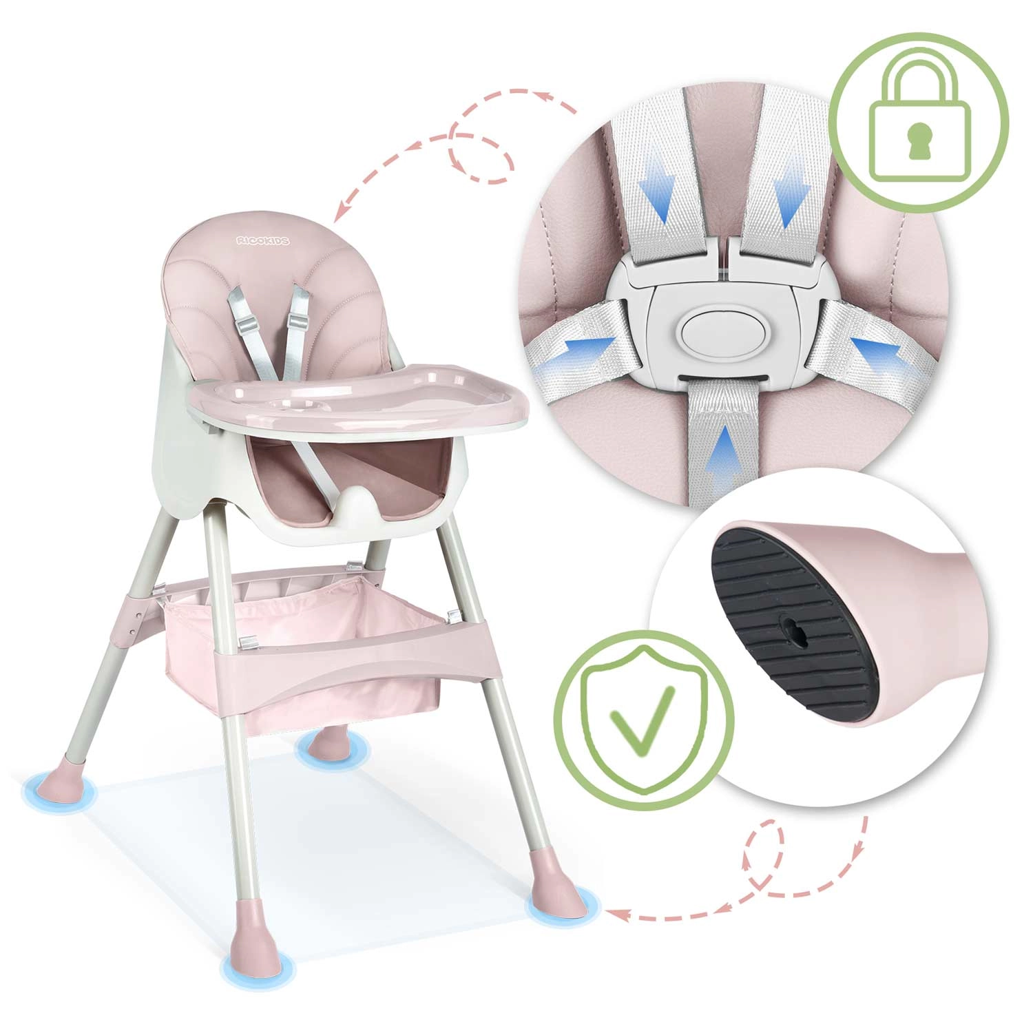 5bodové pásy, protiskluzové nožky a pevná základna zajistí stabilní a bezpečné sezení při jídle i hraní.