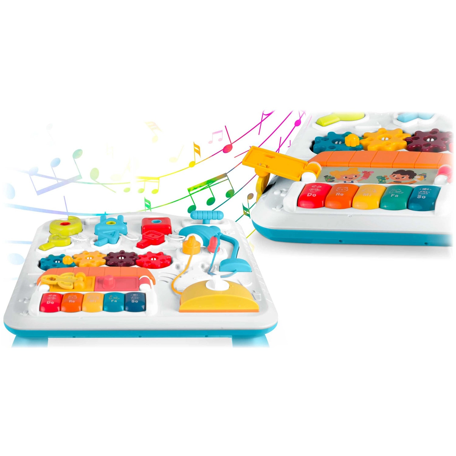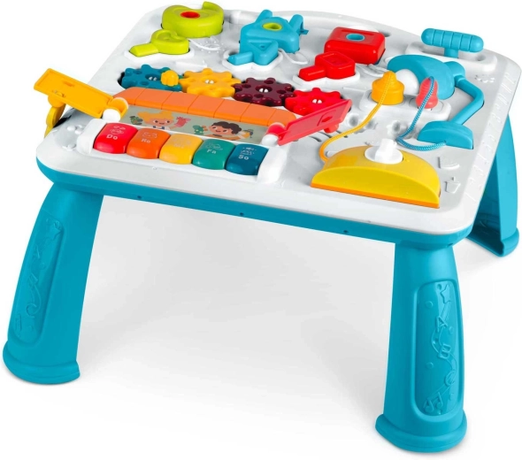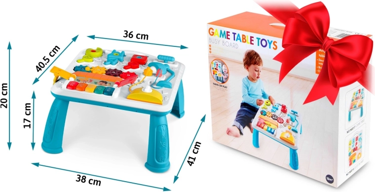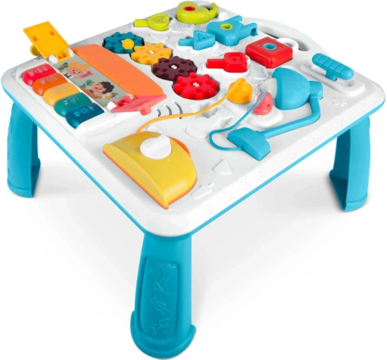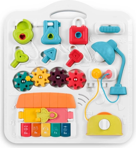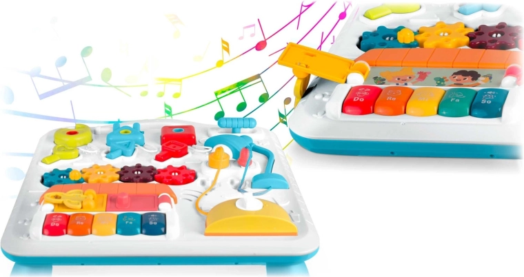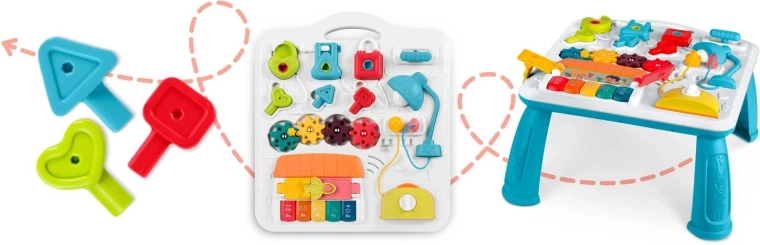Multifunkční dětský stolek a tabule v jednom podporuje senzomotorický rozvoj a učení hrou. Díky odnímatelnému panelu jej dítě využije jak při hraní ve stoje, tak i jako přenosnou sensorickou tabuli na podlaze či na cestách. Bohatá paleta prvků – pianinko s tóny a zvuky zvířátek, rozsvěcující se lampička, točítka, posuvníky, vysouvací „toster“, domeček s dvířky a tři zámky s klíčky – podporuje koordinaci oko–ruka, logiku i rozlišování tvarů.