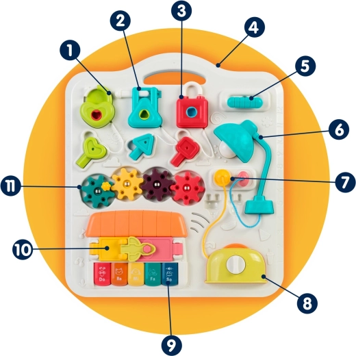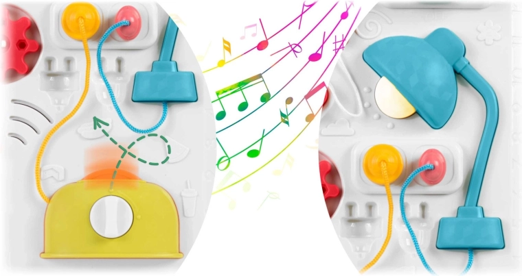 - Pianinko (tóny a zvuky zvířat), LED lampička, ozubená kola, posuvné a mačkací prvky, vysouvací „toster“, domeček s dvířky, zámky s klíčky (srdce, trojúhelník, obdélník)