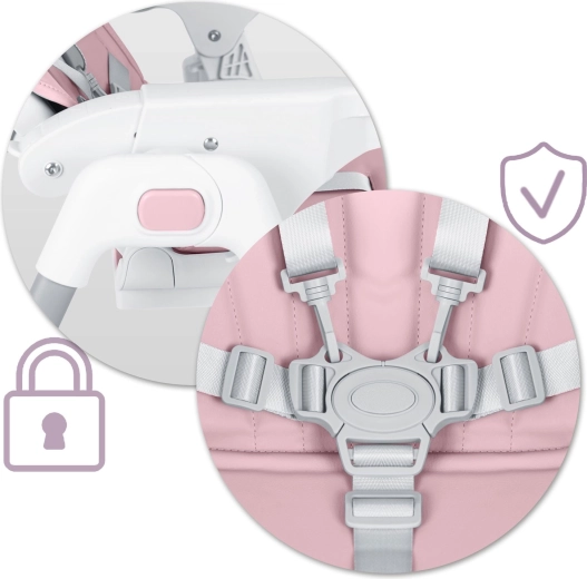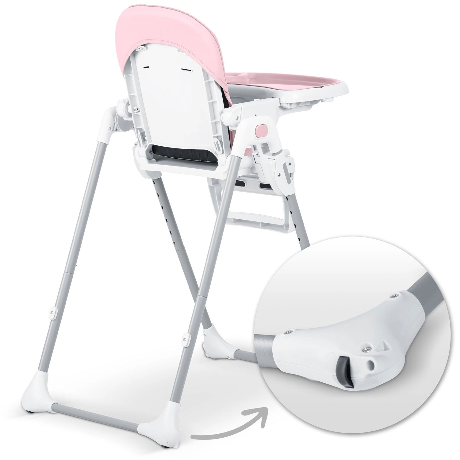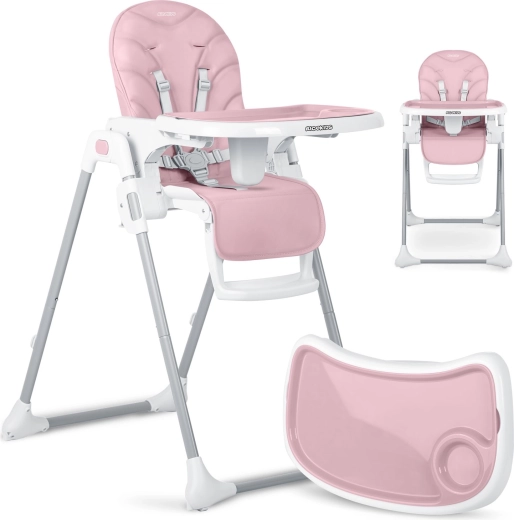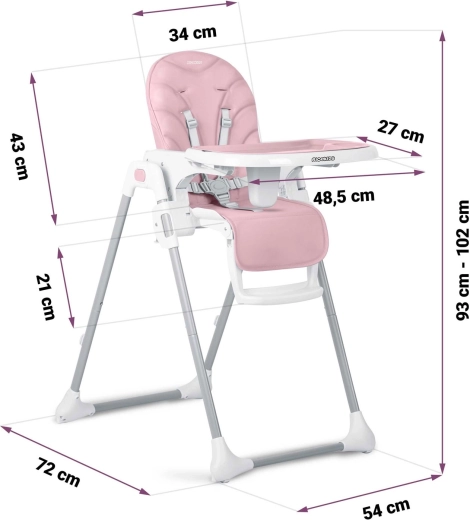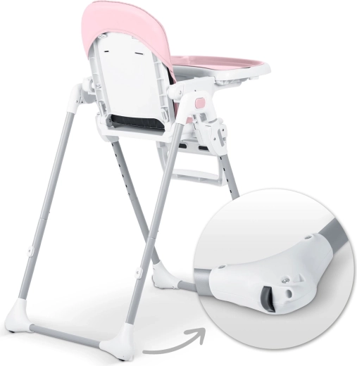 Židlička se rychle skládá do kompaktní podoby pro snadné uložení a má zadní kolečka pro pohodlné přemístění. Pětibodové pásy a stabilní kovová konstrukce se širokými nohami zajišťují vysokou bezpečnost a klid při jídle i hraní.