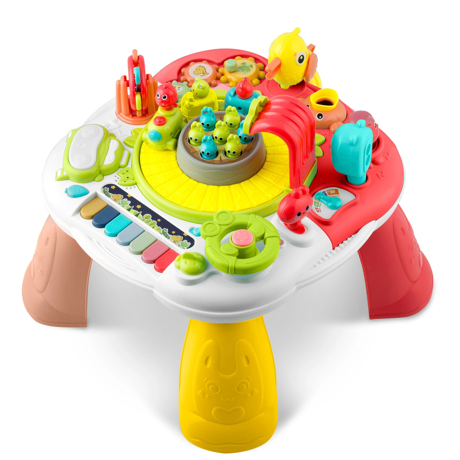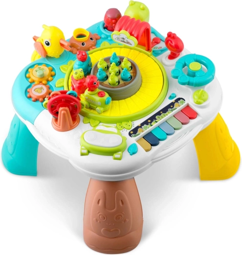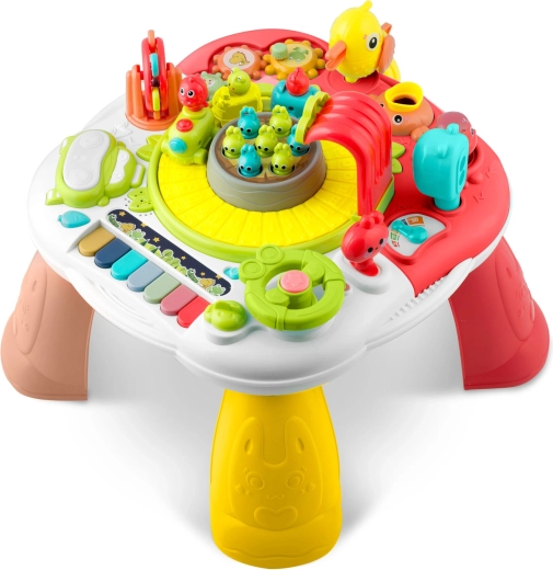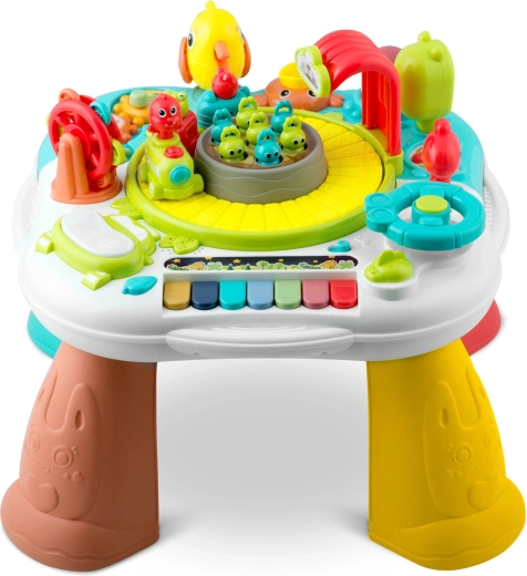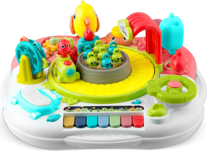 Zábavný a chytrý společník pro děti od 18 měsíců: interaktivní stolek s odnímatelným panelem slouží i jako edukační tabule. Nabízí svítící a hrající prvky, barevné pianínko, automatický vláček, otáčivý kolotoč, ozubená kolečka a celou řadu tlačítek a pák pro rozvoj jemné motoriky, logiky a učení barev. Stabilní konstrukce, rychlá montáž a dvoustupňová regulace hlasitosti potěší děti i rodiče.