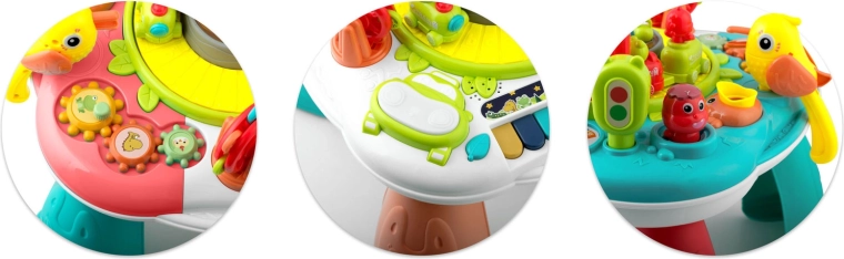 Interaktivní stolek a tabule v jednom spojuje zábavu s učením. Odnímatelný panel můžete použít na zemi nebo po nasazení nožiček jako samostatně stojící stolek. Dítě si užije světýlka, hudbu, pohyblivé prvky i hru na pianínko, zatímco trénuje koordinaci oko–ruka a učí se barvy a příčinu–následek.