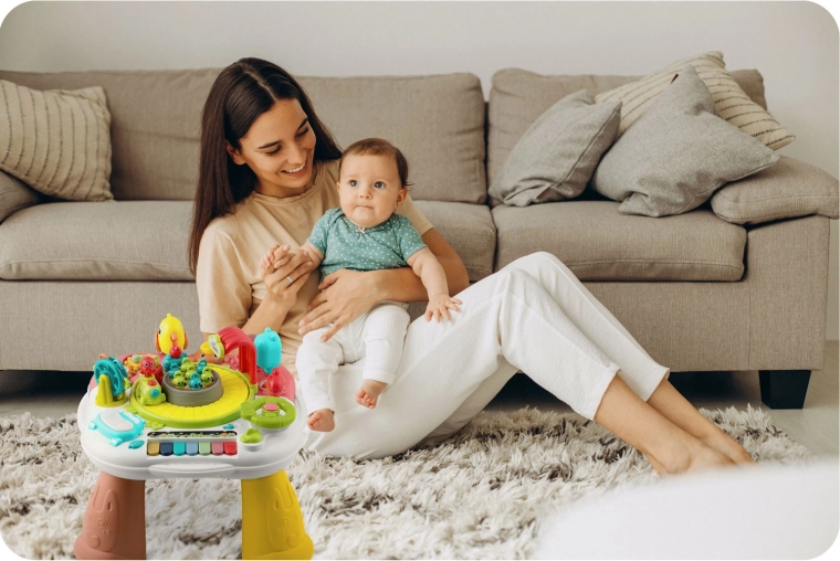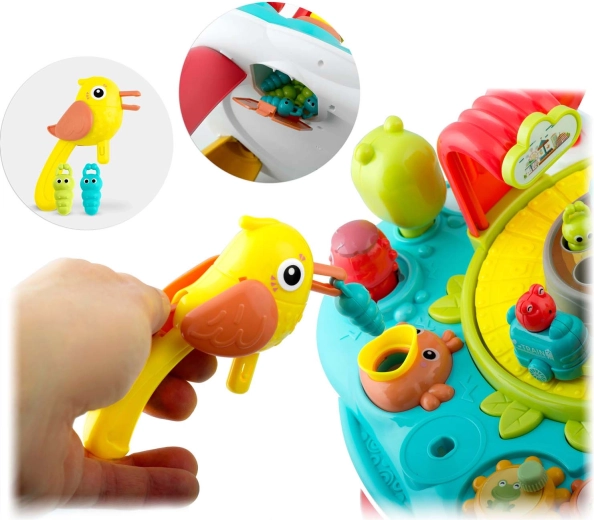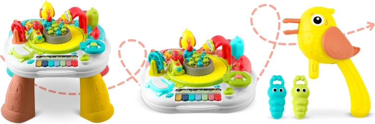 Součástí je i automatický vláček, který sám jezdí a upoutá pozornost, kolotoč a svítící autíčko. Hra „krmení ptáčátka červíky“ podporuje úchop a přesnost. Rodiče ocení možnost úplného vypnutí zvuku a 2 úrovně hlasitosti, stejně jako pevné zpracování a snadnou montáž.