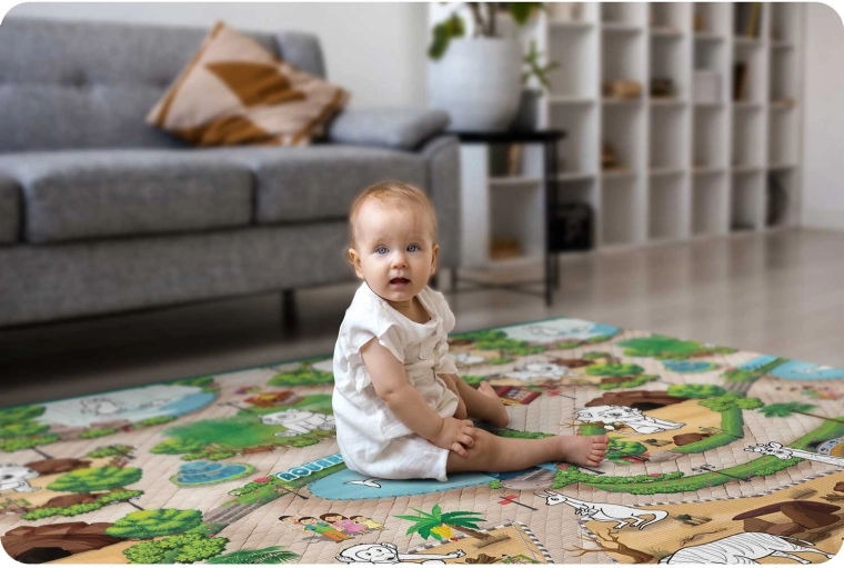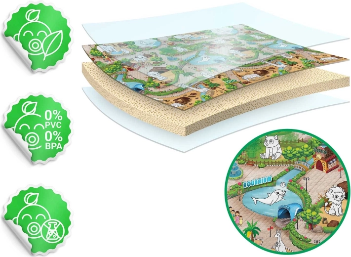 Podložku snadno udržíte v čistotě – stačí ji otřít vlhkým hadříkem, bez použití chemikálií. Je odolná, voděodolná a pečlivě obšitá kvalitní textilní lemovkou pro delší životnost. Splňuje přísné normy bezpečnosti (CE, EN71-1, EN71-2, EN71-3) a je vhodná i pro alergiky, protože nezachytává prach ani roztoče.