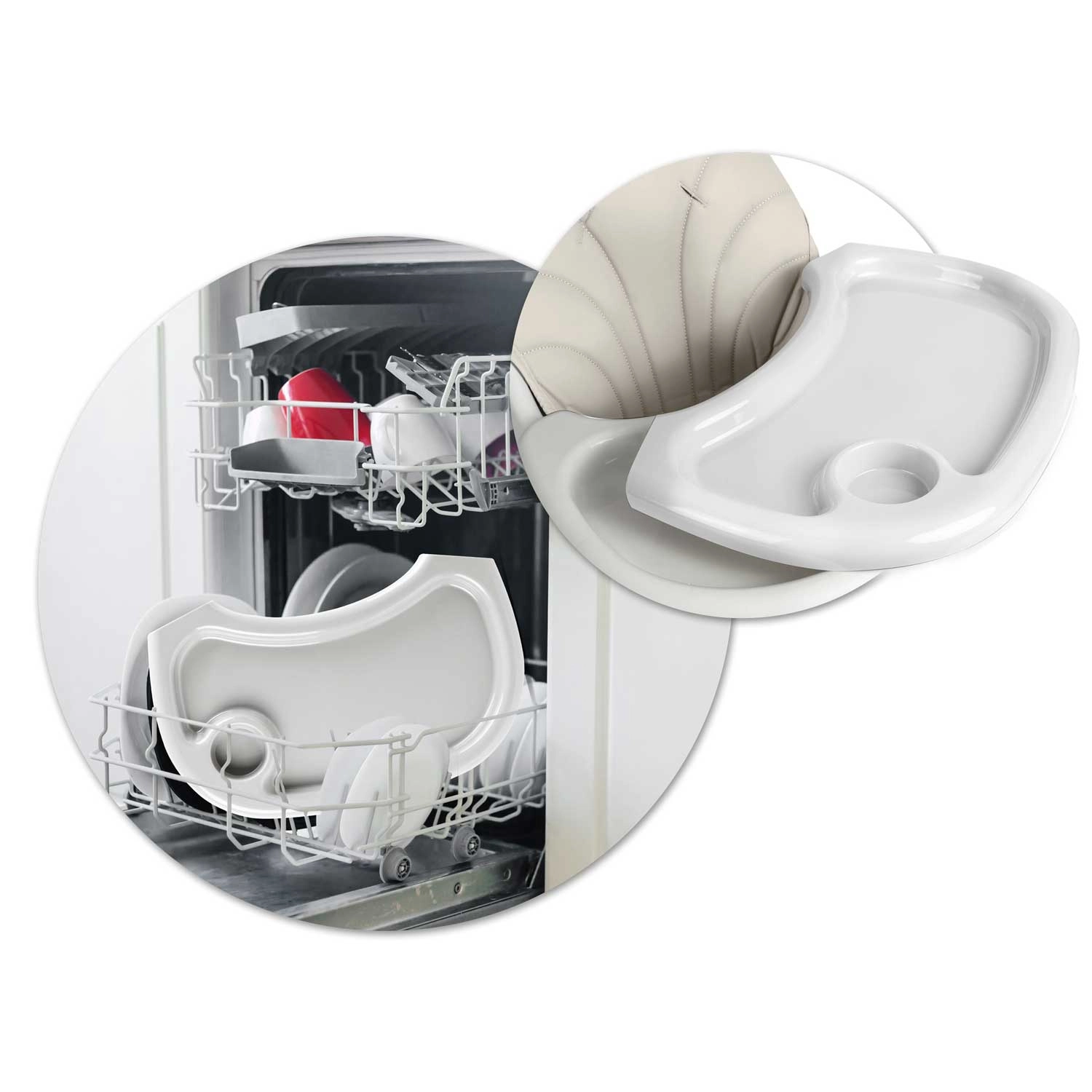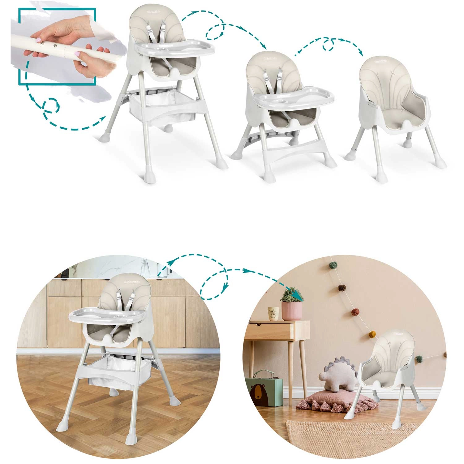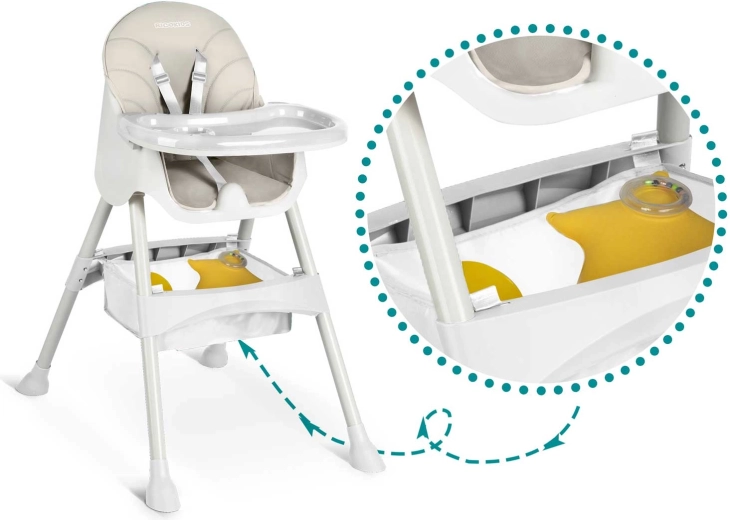 Bezpečnost je na prvním místě: 5bodové pásy, protiskluzové koncovky nohou a konstrukce splňující evropskou normu EN 14988 zajišťují jistotu při jídle i hře. Měkké čalounění je z materiálu, který neabsorbuje nečistoty – stačí jej otřít vlhkým hadříkem. Součástí je také úložný koš na hračky a potřeby a silkonový bryndák zdarma.