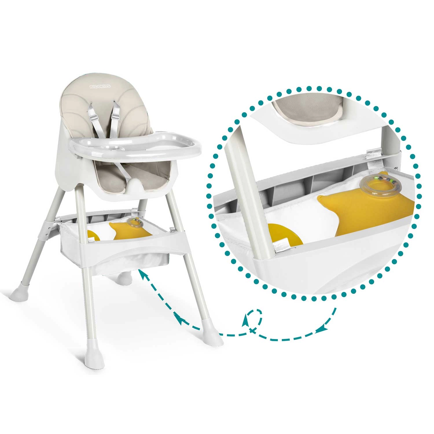 RICOKIDS Milo je lehká a pohodlná dětská jídelní židlička, která se snadno přizpůsobí aktuálním potřebám – poslouží jako vysoká židlička k jídelnímu stolu i jako nízká židle pro větší dítě. Díky kompaktnímu skládání ji rychle uložíte, zatímco odnímatelný pultík s vložkou a zvýšenými okraji usnadní krmení i úklid.