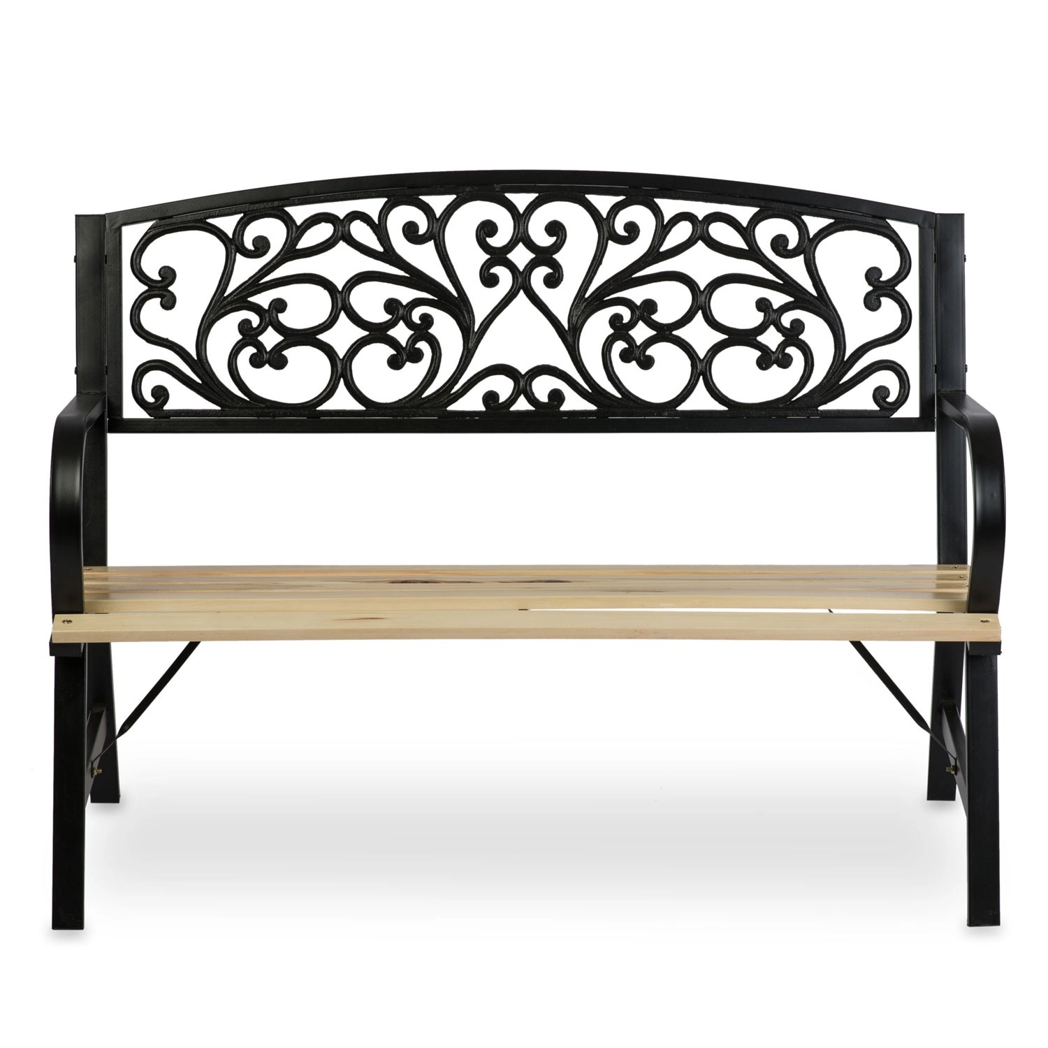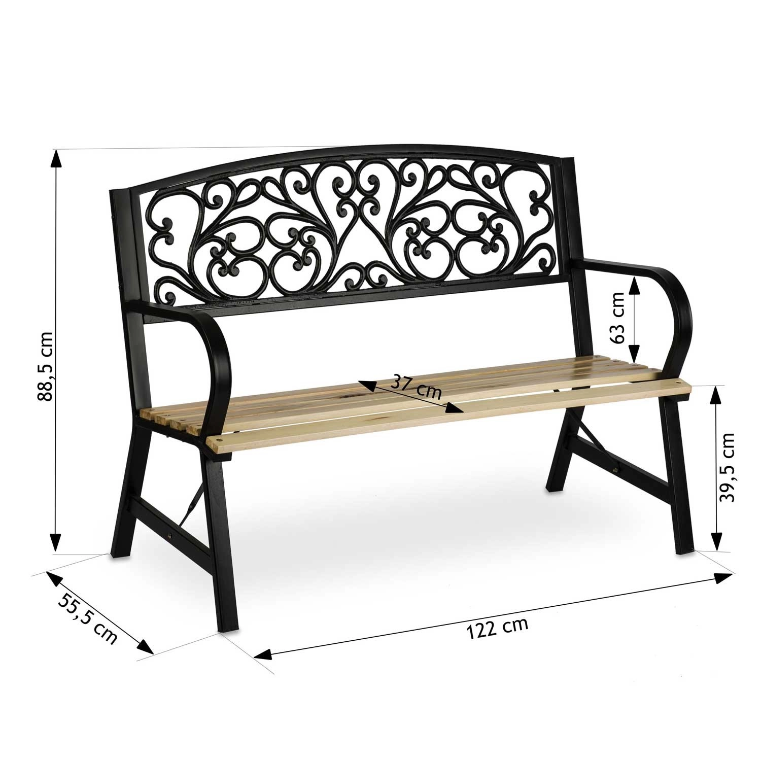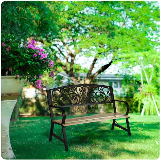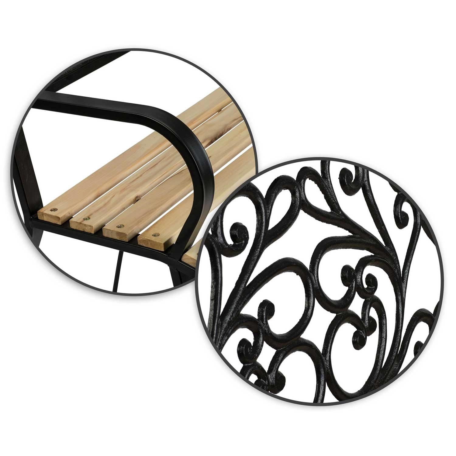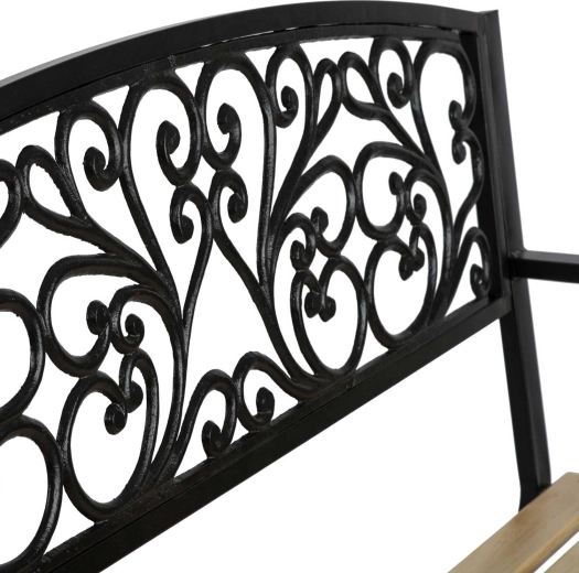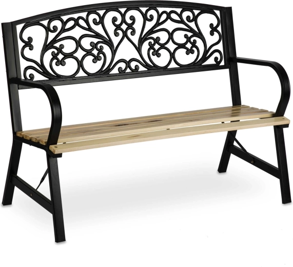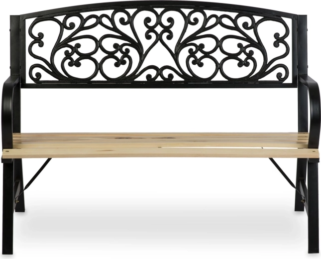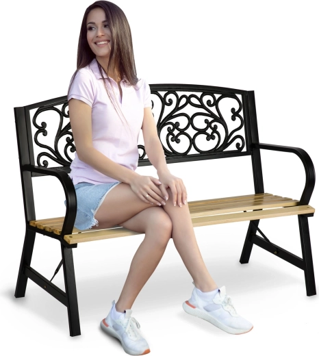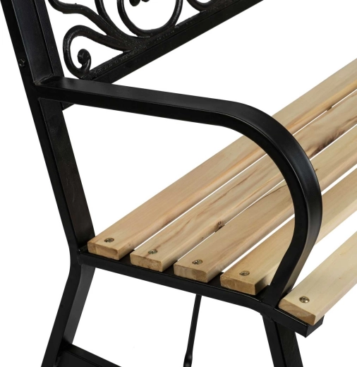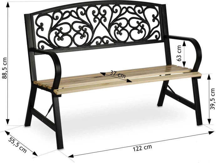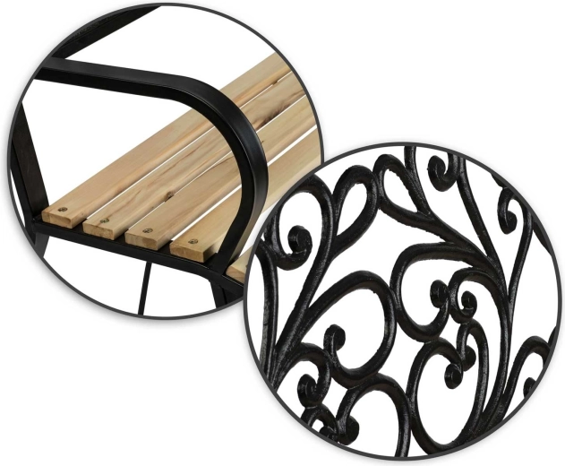 Široké dřevěné lamely a ergonomická opěrka zad poskytují komfort, zatímco robustní nohy s výztuhami garantují stabilní posezení.