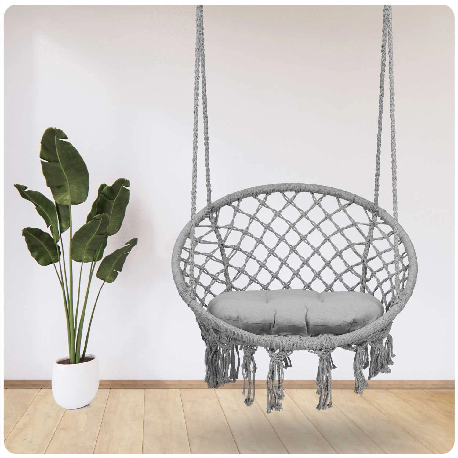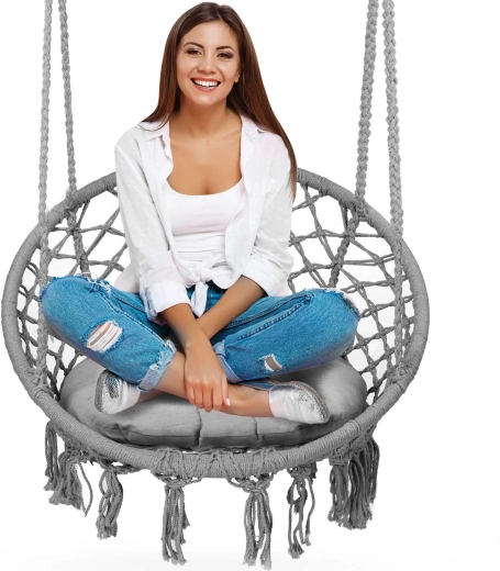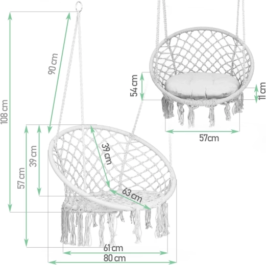 Kovové obruče, hustý makramé výplet a dvojitě pletená lana zajišťují stabilitu, odolnost a nosnost až 150 kg.