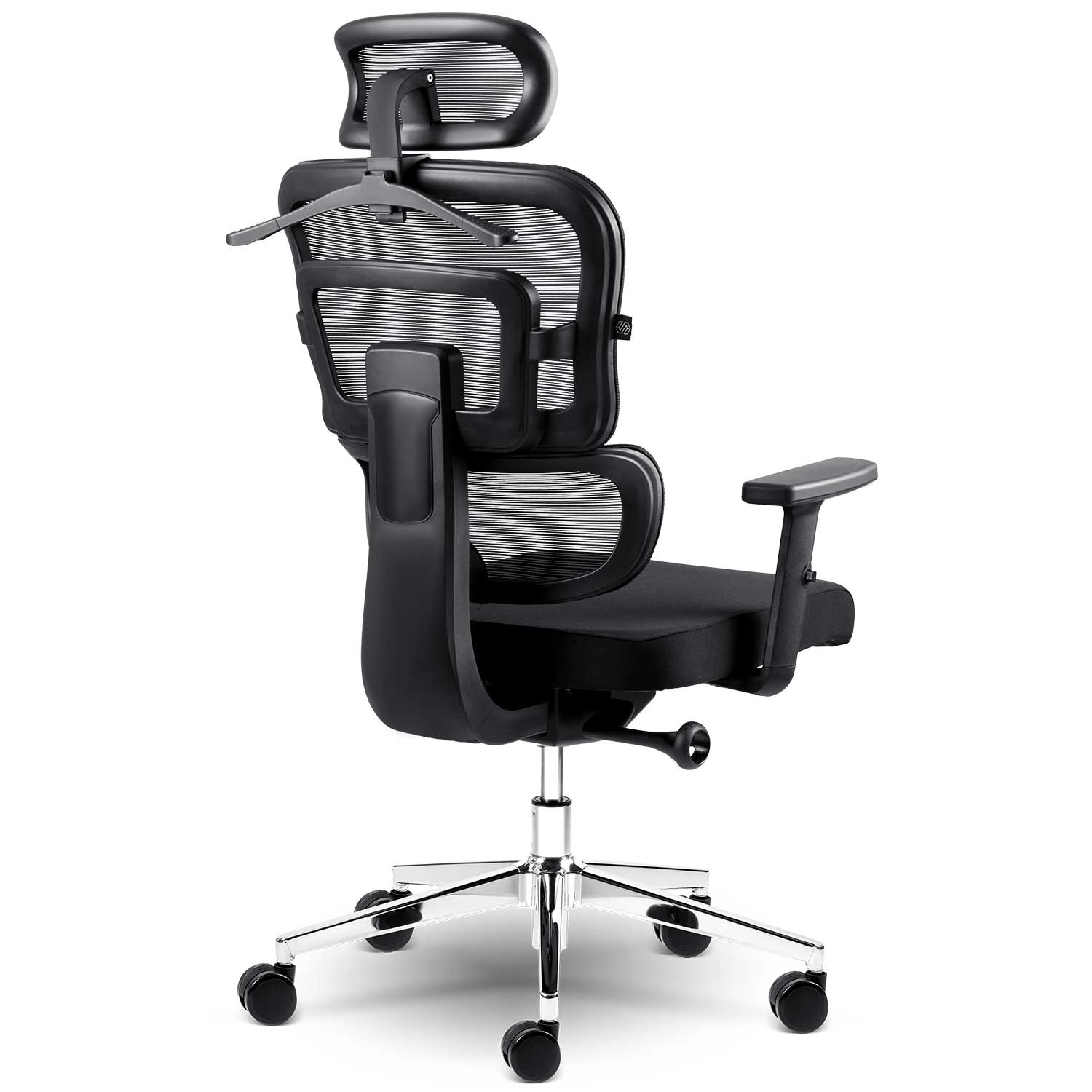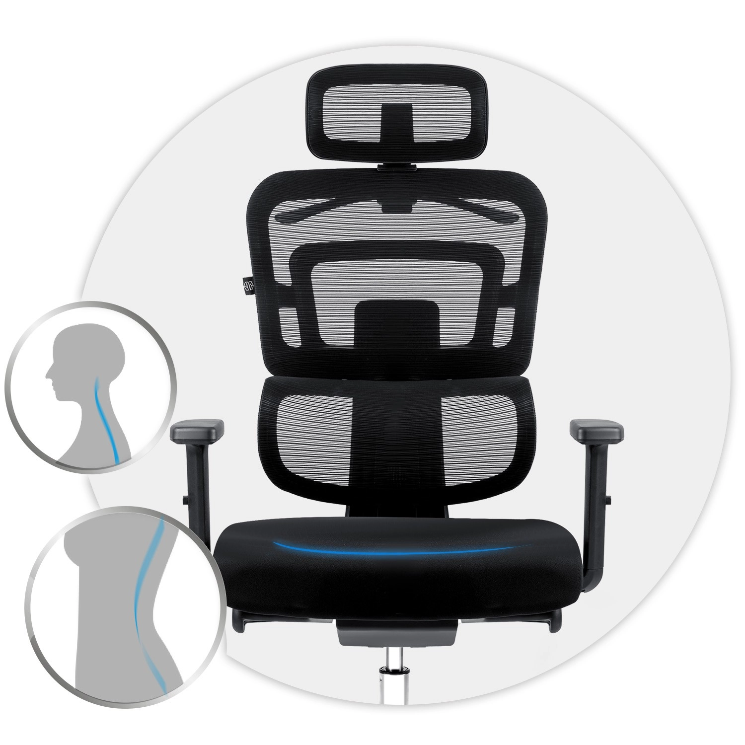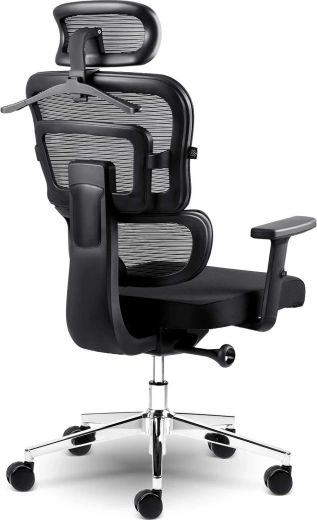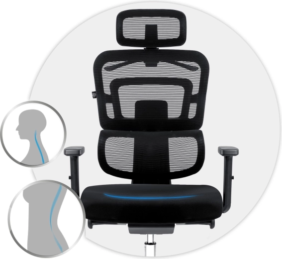 Opěrák z odolné síťoviny zajišťuje stálé proudění vzduchu a pohodlí i při dlouhých pracovních dnech, s integrovanou bederní podporou pro zdravé držení těla.
