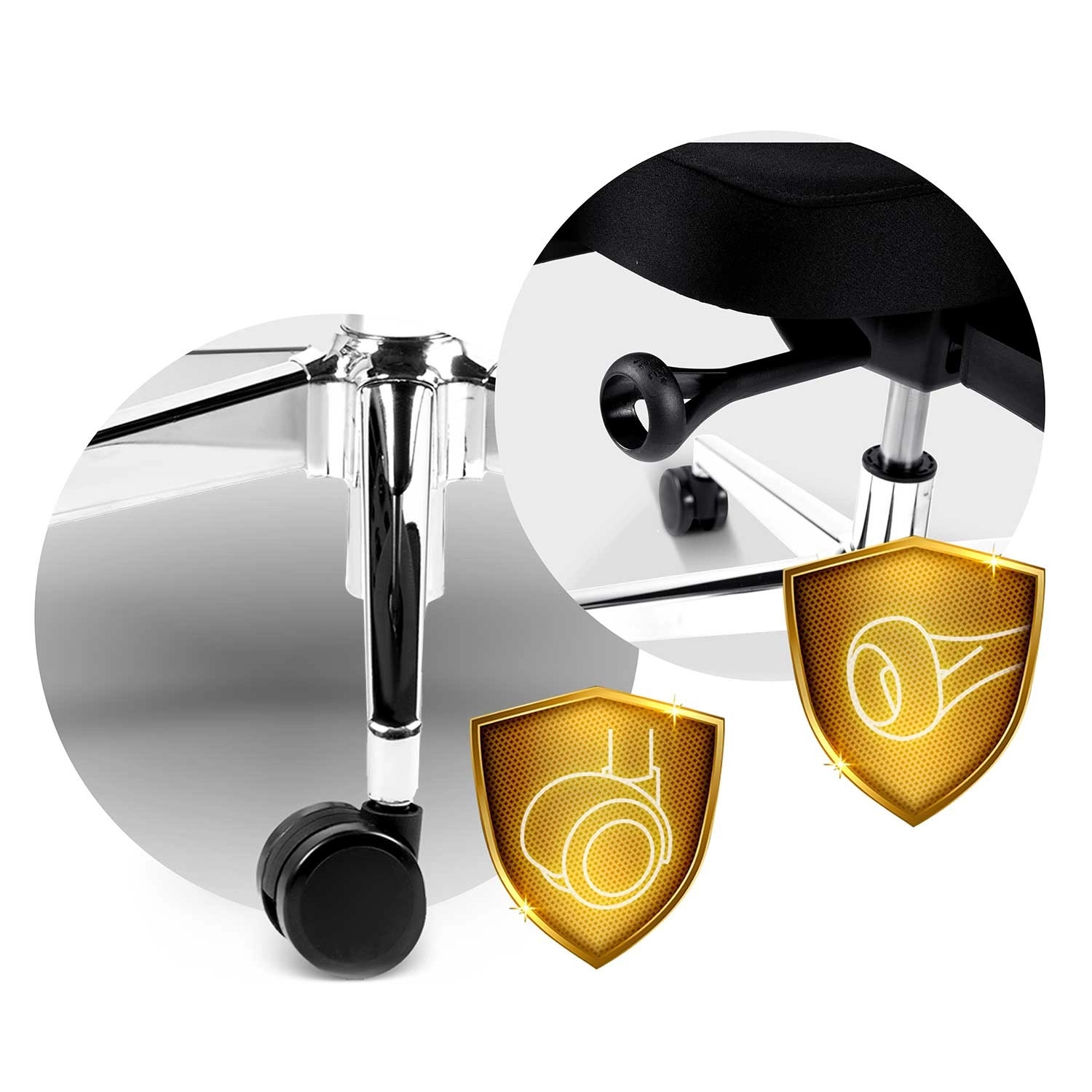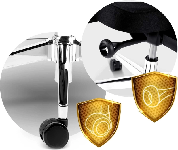 Chromovaná pětiramenná základna odolná proti poškrábání v kombinaci s dvojitými nylonovými kolečky zaručuje stabilitu a tichý pohyb bez poškození podlahy.