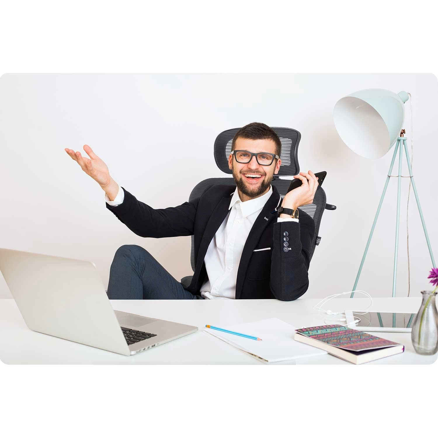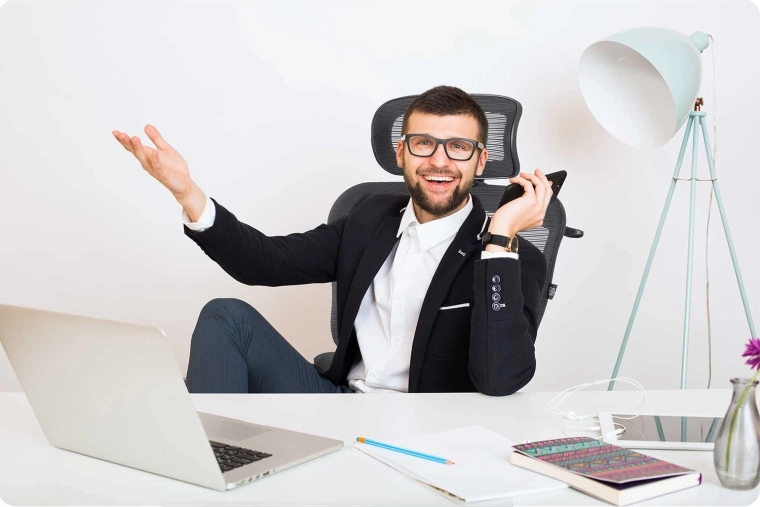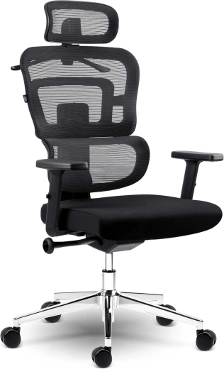 Chromovaná pětiramenná základna je odolná proti poškrábání a spolu s dvojitými nylonovými kolečky zajišťuje stabilitu a tichý pohyb bez poškození podlahy. Nastavitelné područky a měkké, husté polstrování sedáku zvyšují komfort při dlouhém sezení. Praktický věšák na opěradle udrží sako vždy po ruce a ve formě.