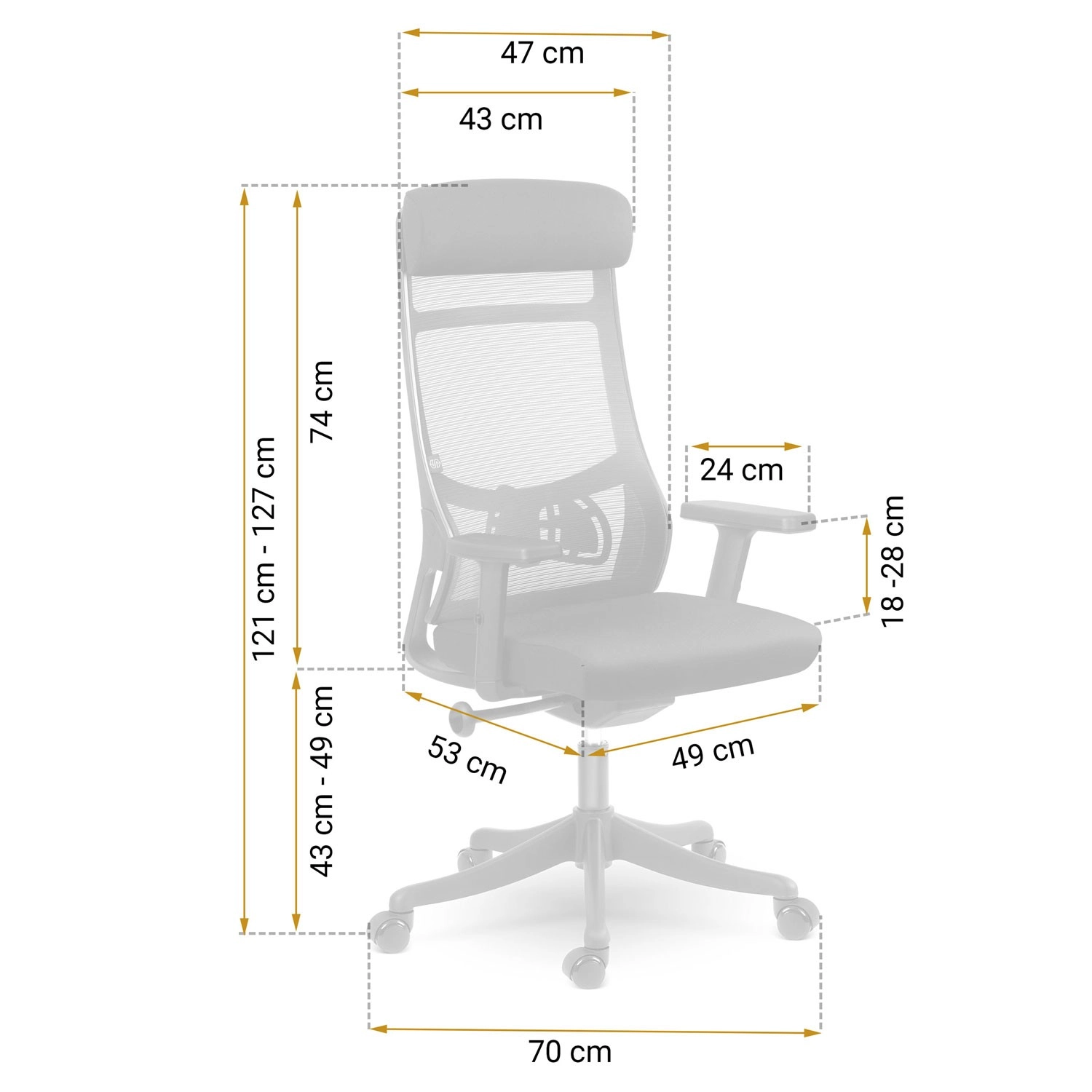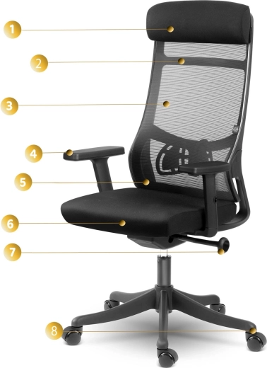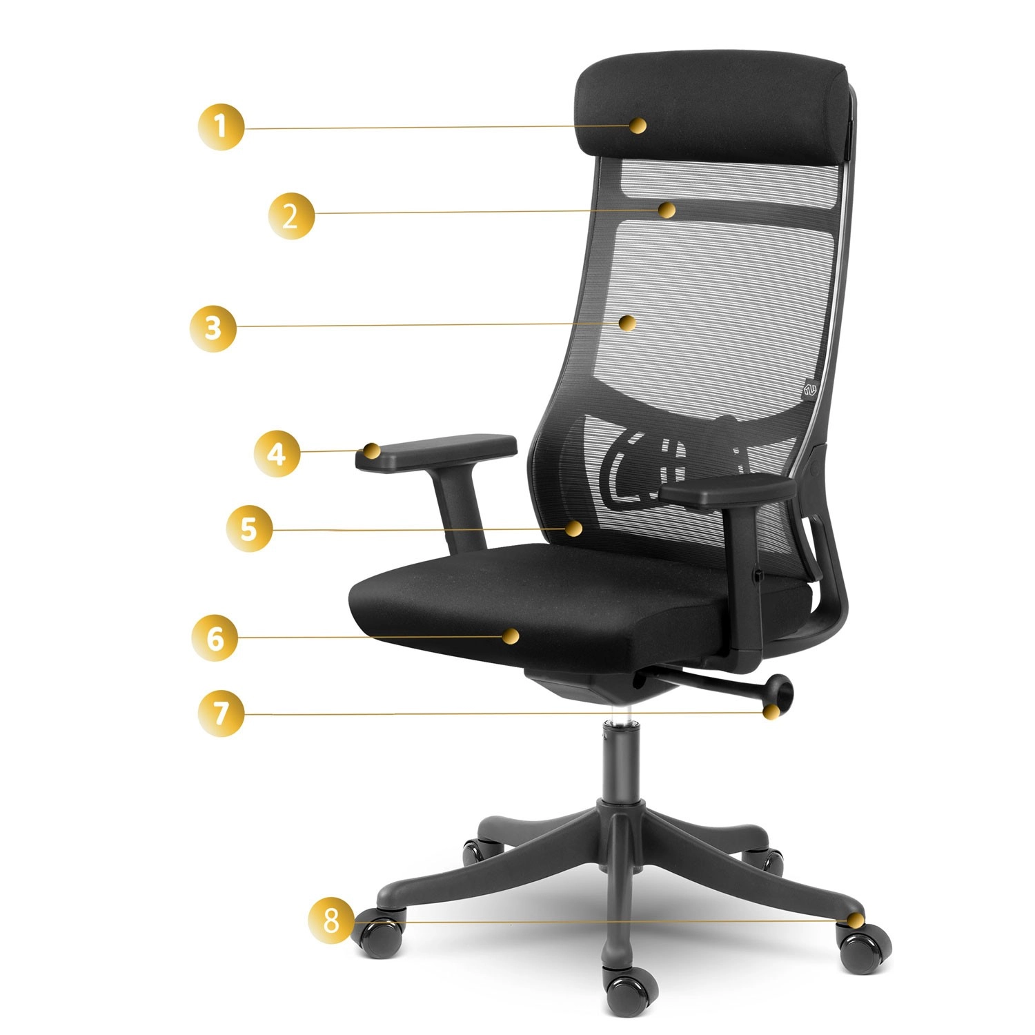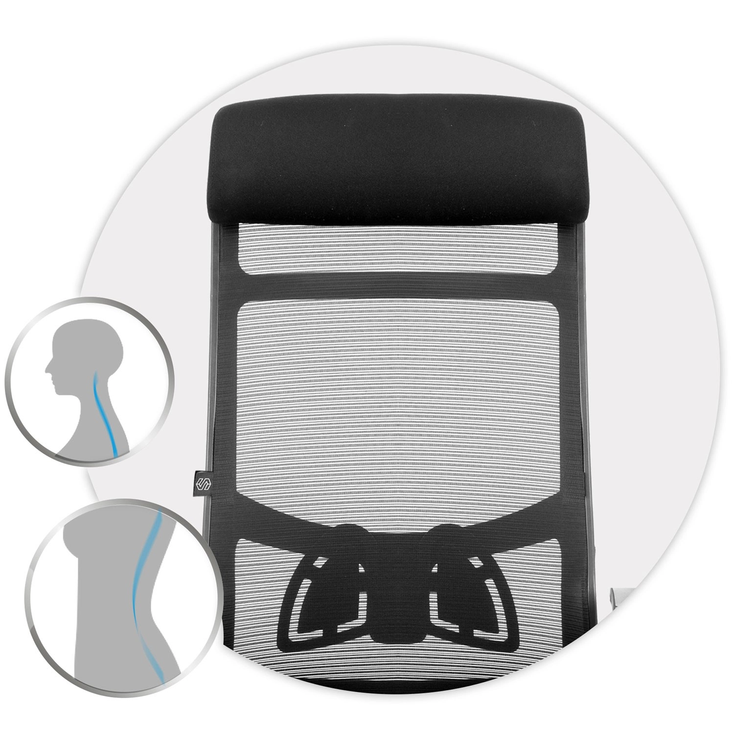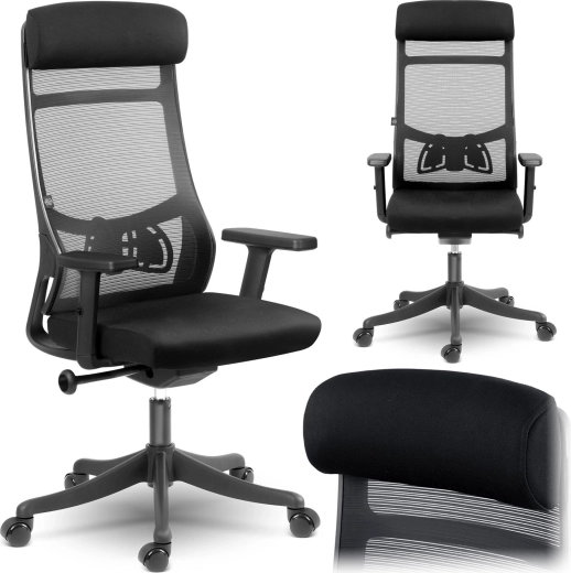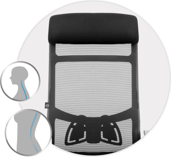 Vysoké opěradlo s bederní podporou a mikrosíťovinou zajišťuje zdravé držení těla a stálou cirkulaci vzduchu i při celodenním sezení.