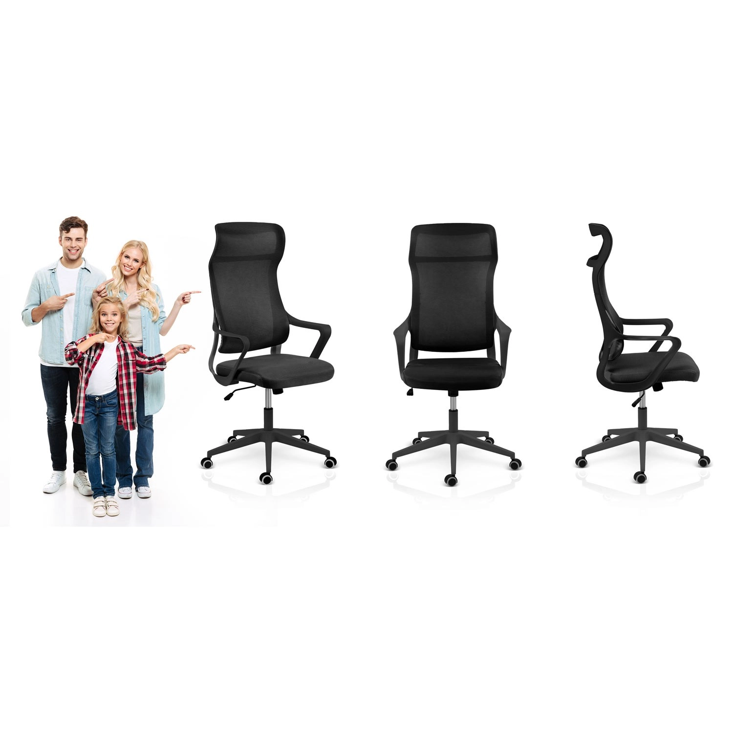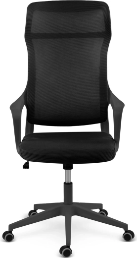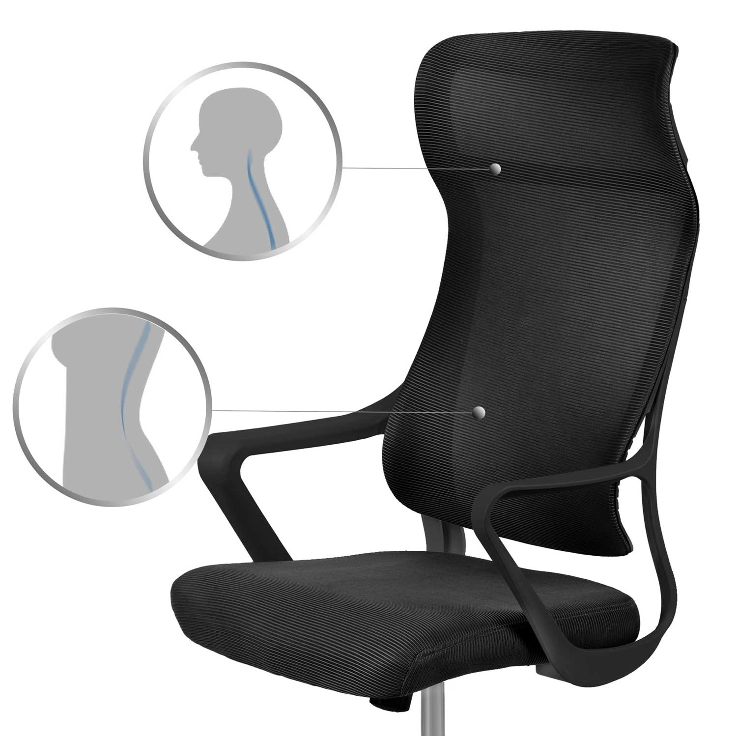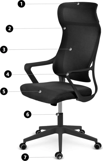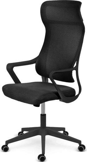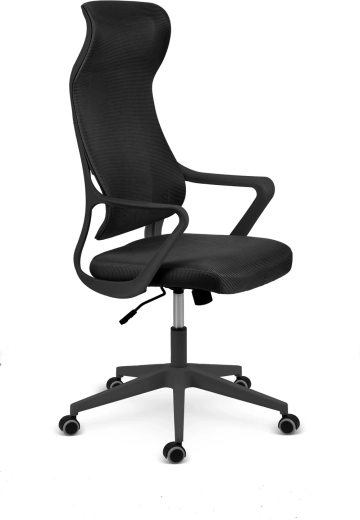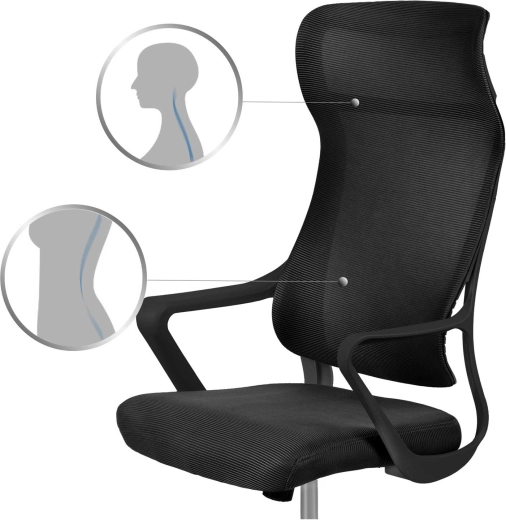 Vysoký opěrák z mikrosítě s tvarovanou bederní oporou zlepšuje držení těla a udržuje záda v příjemné teplotě i při dlouhém sezení.