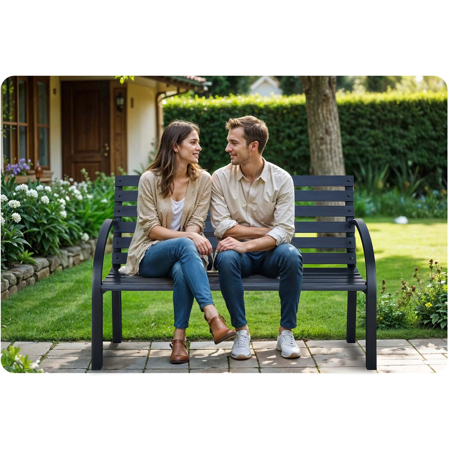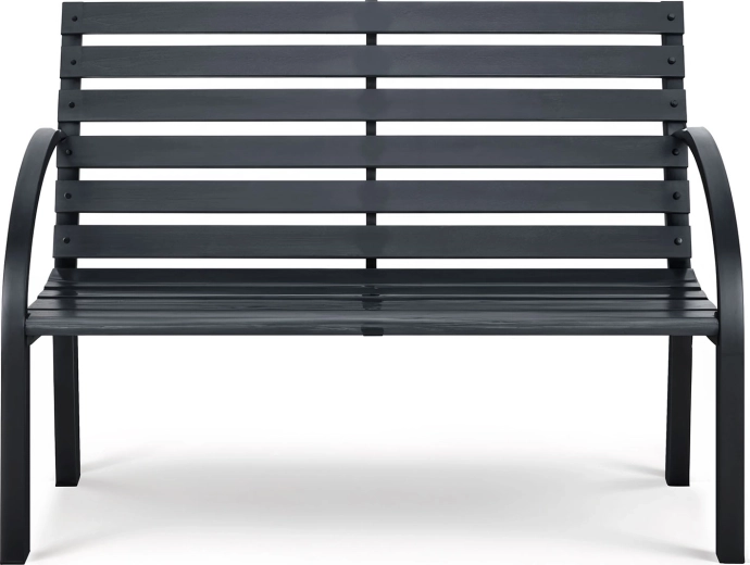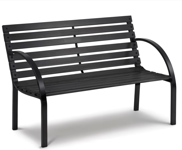 Lakované dřevěné lamely a ocelový rám s práškovým lakem odolají dešti i slunci, takže lavice zůstane stabilní a krásná po celý rok.