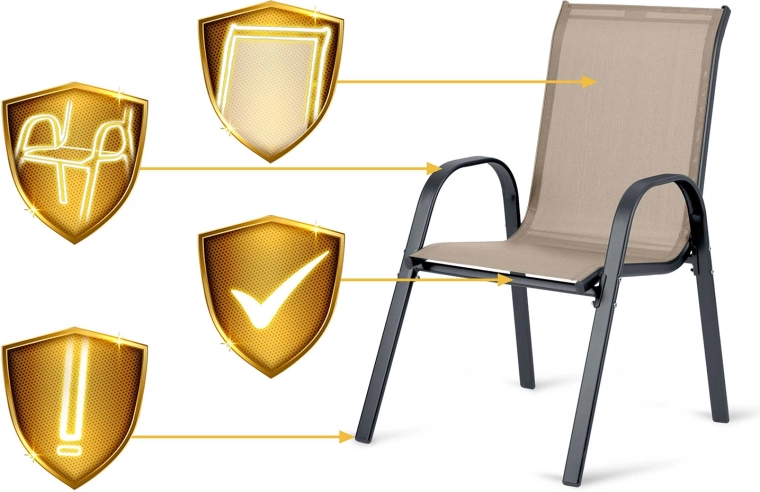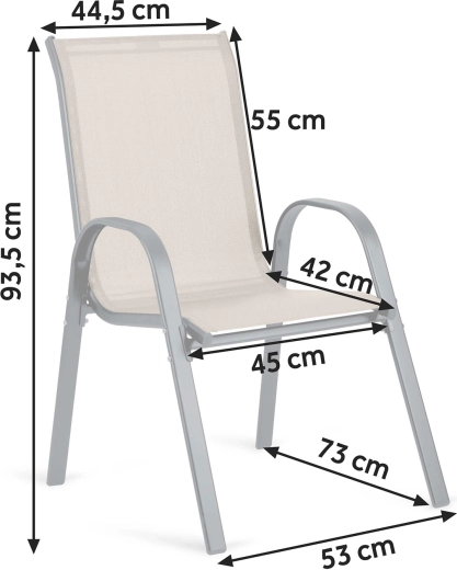 Rám ze stali s práškovým lakem je chráněn proti korozi a zvládne každodenní používání. Ergonomicky tvarované sedadlo a opěradlo společně s područkami podporují správné držení těla. Díky odolnosti vůči vodě a UV si židle udrží svůj vzhled i po sezóně.