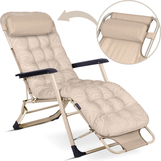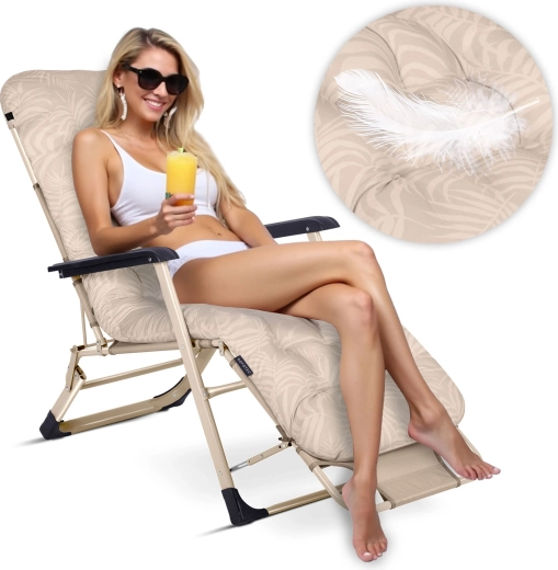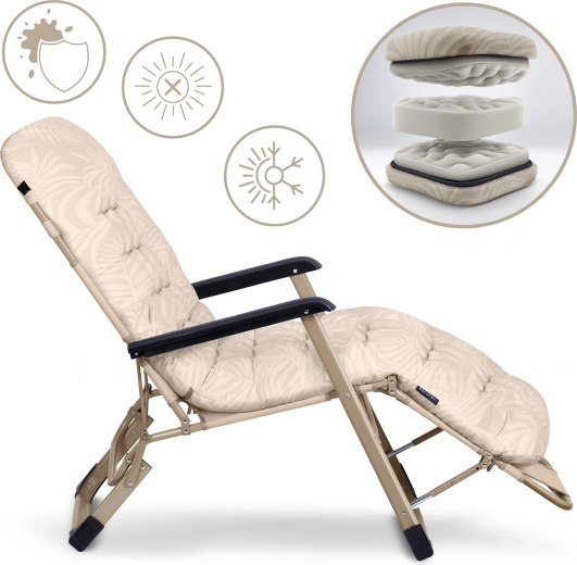 Odolná textilie Texline je snadná na čištění, rychle schne a je rezistentní vůči UV záření i teplotním výkyvům. Robustní kovový rám se stabilní konstrukcí doplňují pevné opěrky rukou a protiskluzové koncovky nožek pro bezpečné používání na různých površích. Skládací mechanismus šetří místo a usnadňuje transport – ideální parťák na dovolenou.
