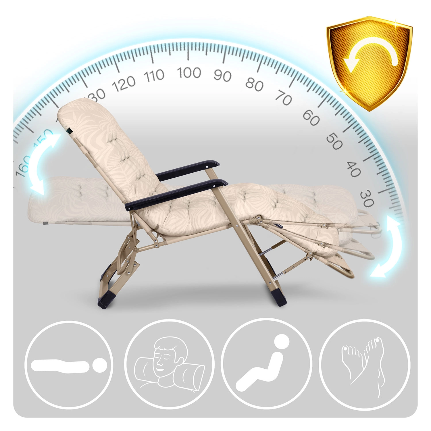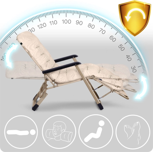 Plynulá regulace opěradla a 3stupňová podnožka vám umožní najít ideální polohu pro čtení, odpočinek i spánek. Zvednuté nohy podporují cirkulaci a ulevují páteři.