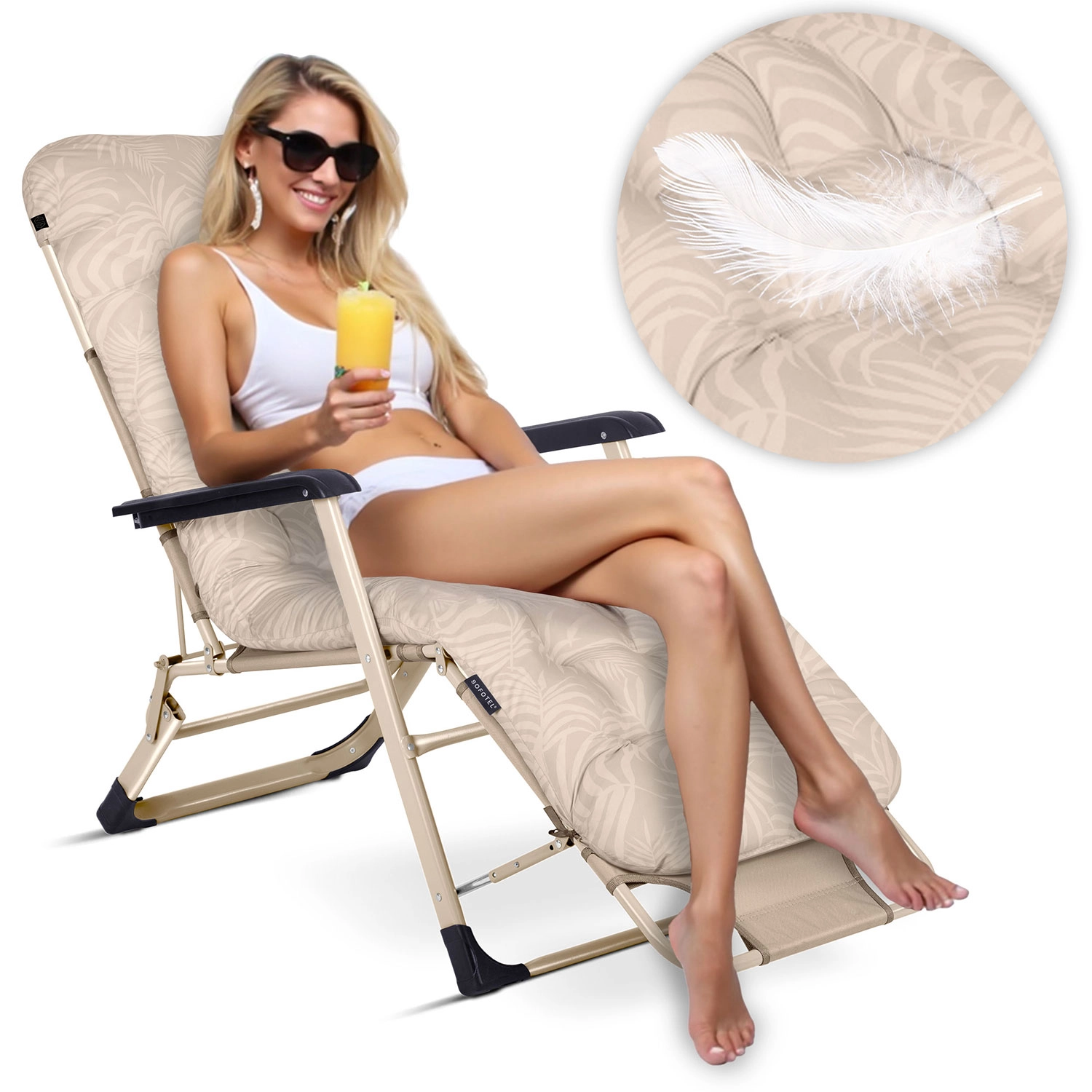 Užijte si venkovní relax bez kompromisů se stylovým lehátkem Sofotel ChillWell. Díky měkkému, silně vyplněnému polštáři, nastavitelnému sklonu až do polohy vleže a odolné konstrukci je ideální na zahradu, terasu i pláž. Rychleschnoucí tkanina, UV odolnost a skládací design zaručují pohodlí, snadnou údržbu i snadné přenášení.