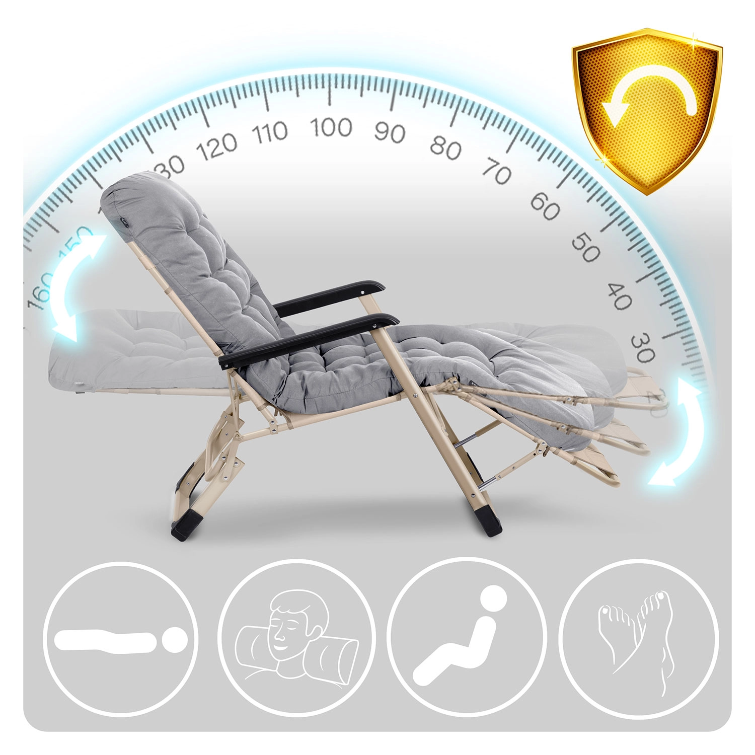 Texline rychle schne a snadno se čistí, UV‑odolné područky a stabilní rám s protiskluzovými koncovkami zajistí dlouhou životnost i bezpečí.