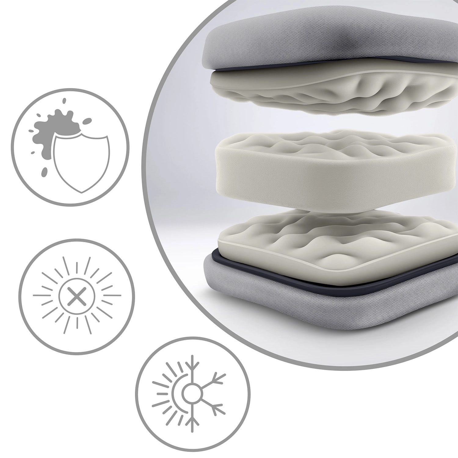 Měkký, pružný a prošívaný polštář s odnímatelným podhlavníkem podpírá hlavu, krk i záda a zajišťuje dlouhodobé pohodlí bez tlakových bodů.
