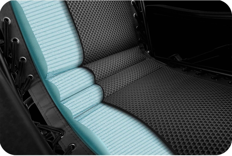 - Prémiové materiály: prodyšná a UV odolná tkanina 3D FoamGrid™, rychleschnoucí povrch.
