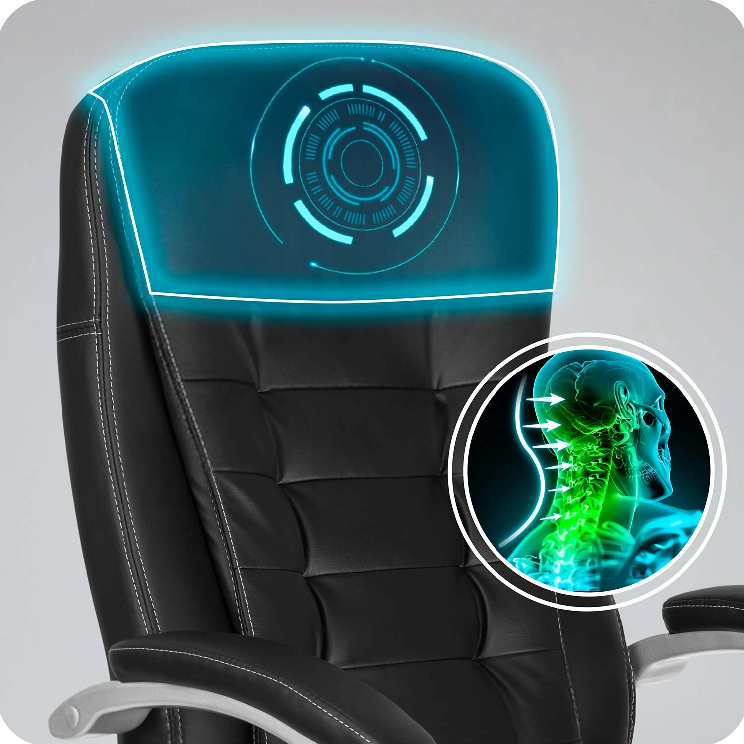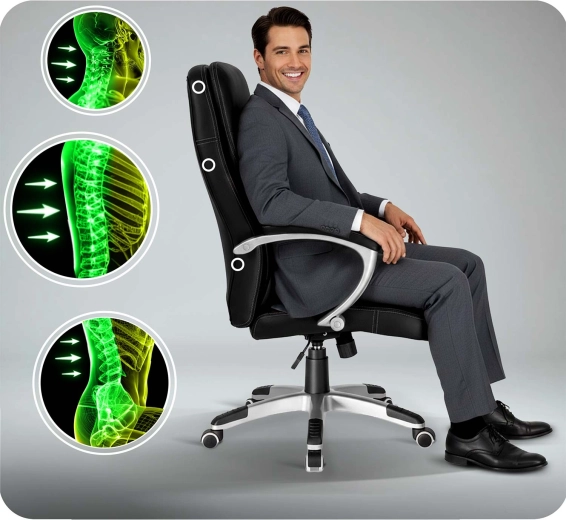 Vyprofilovaná bederní část a hlavová opora rovnoměrně rozkládají tlak, ulevují krční i bederní páteři a zlepšují soustředění při práci.
