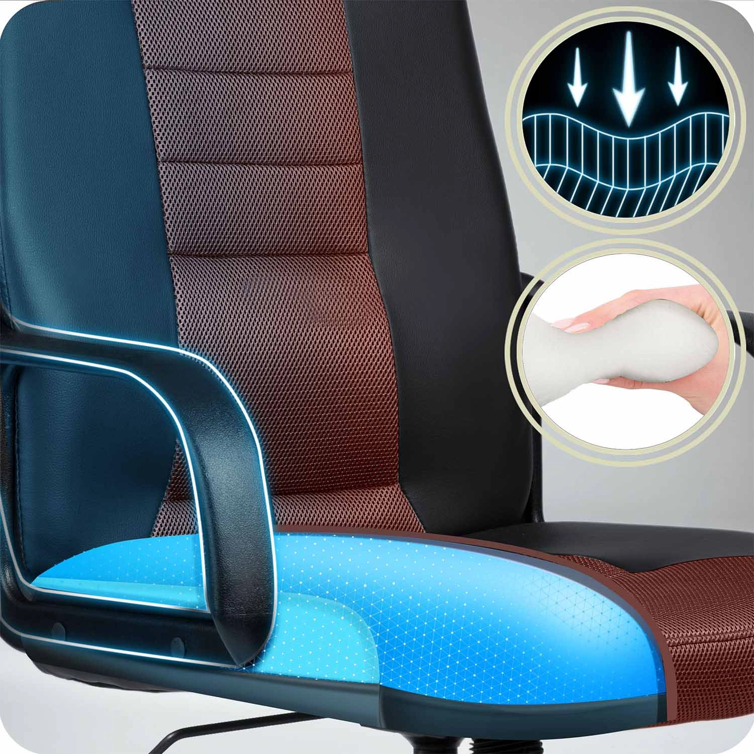 Kancelářská židle Sofotel je navržená pro komfort a produktivitu. Vysoké opěradlo s profilovanou bederní oporou pomáhá udržet správné držení těla, zatímco měkké polstrování sedáku i zad příjemně rozkládá tlak. Čalounění v elegantním černo‑hnědém provedení skvěle zapadne do moderní kanceláře i domácí pracovny.