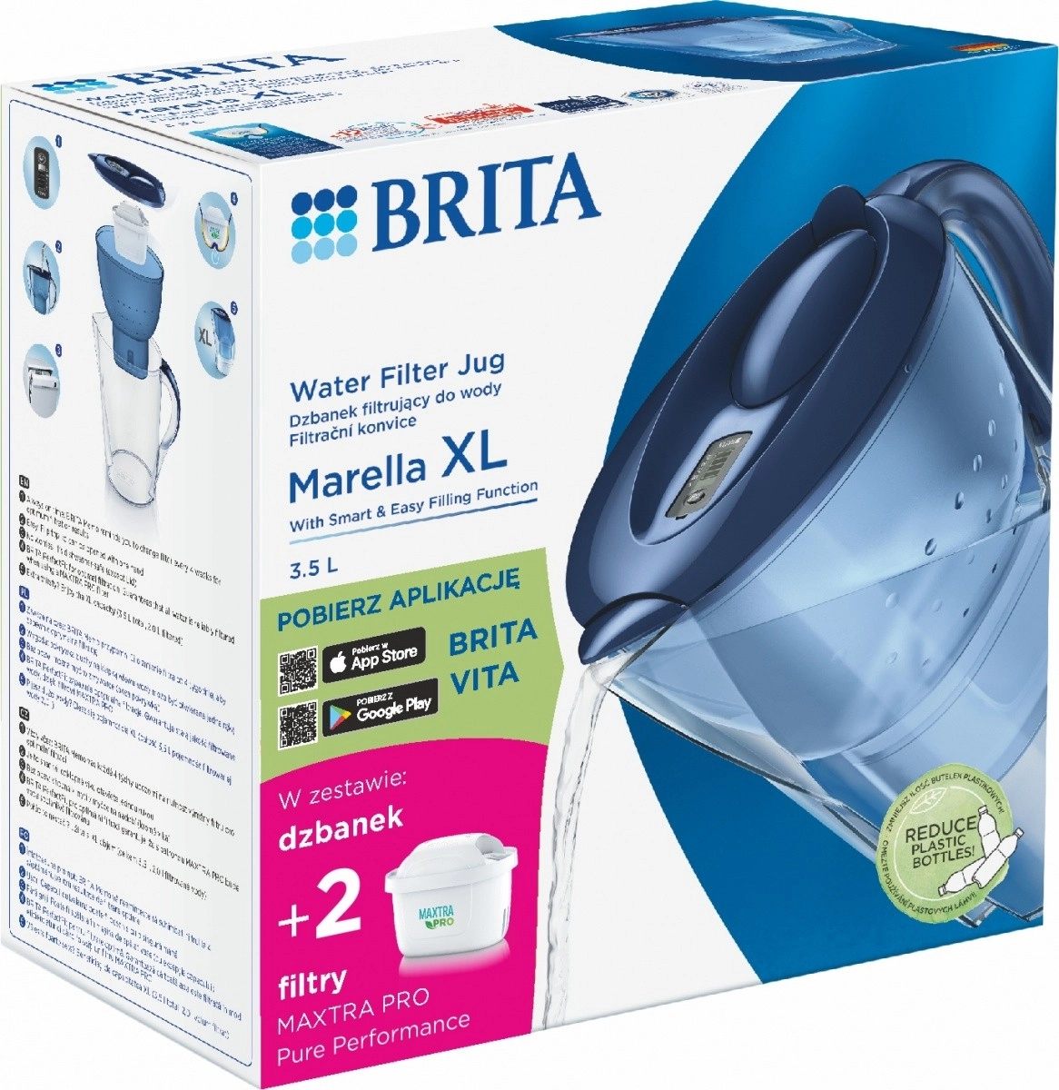 Objevte praktickou filtrační konvici BRITA Marella XL s objemem 3,5 l a dvěma filtry MAXTRA PRO Pure Performance pro čistší a chutnější vodu každý den. Díky pokročilé 4stupňové filtraci zlepší chuť nápojů i pokrmů, sníží tvorbu vodního kamene a nabídne pohodlné plnění jednou rukou. Konvice je vhodná do myčky (kromě víka s indikátorem) a má elektronický ukazatel výměny filtru.
