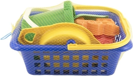 Hravá dětská sada na písek s praktickým košíkem obsahuje vše potřebné pro zábavu na pláži i pískovišti: kyblík, lopatku, rýč, hrabičky, sítko a 2 bábovky. Lehký odolný plast je vhodný pro děti od 12 měsíců a podporuje jemnou motoriku a fantazii.