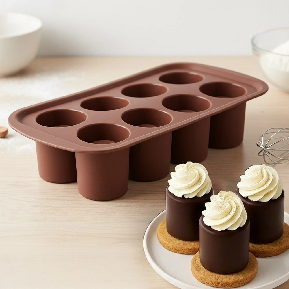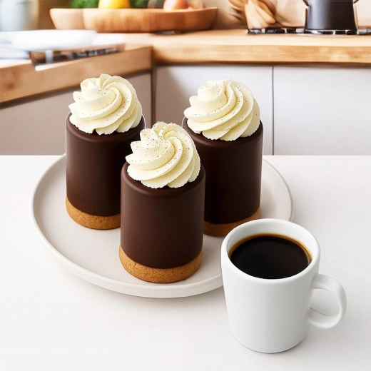 Každá dutina tvoří vysoký válcovitý tvar s místem pro plnění krémem, ovocem, pěnou nebo likérem – ideální na elegantní servírování.