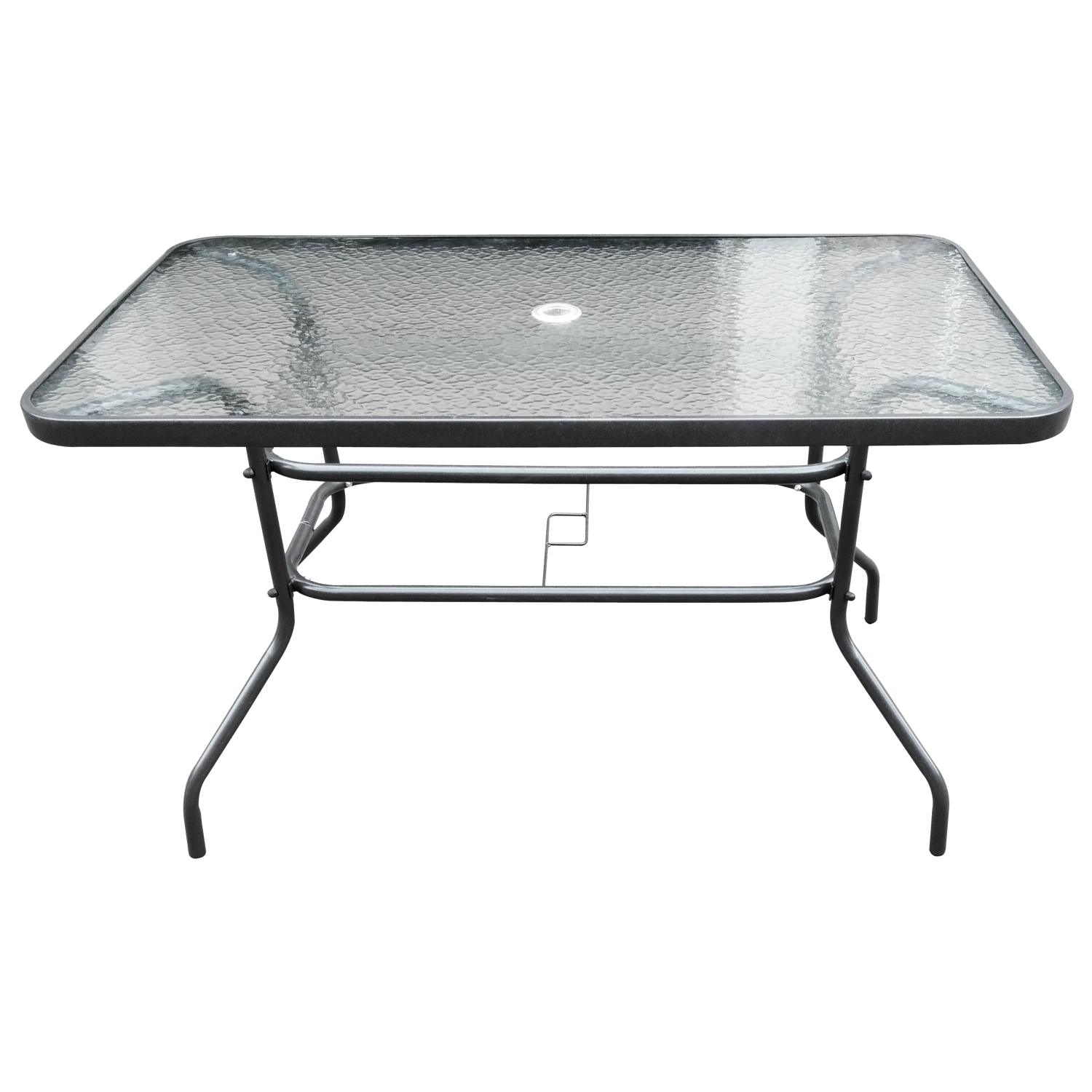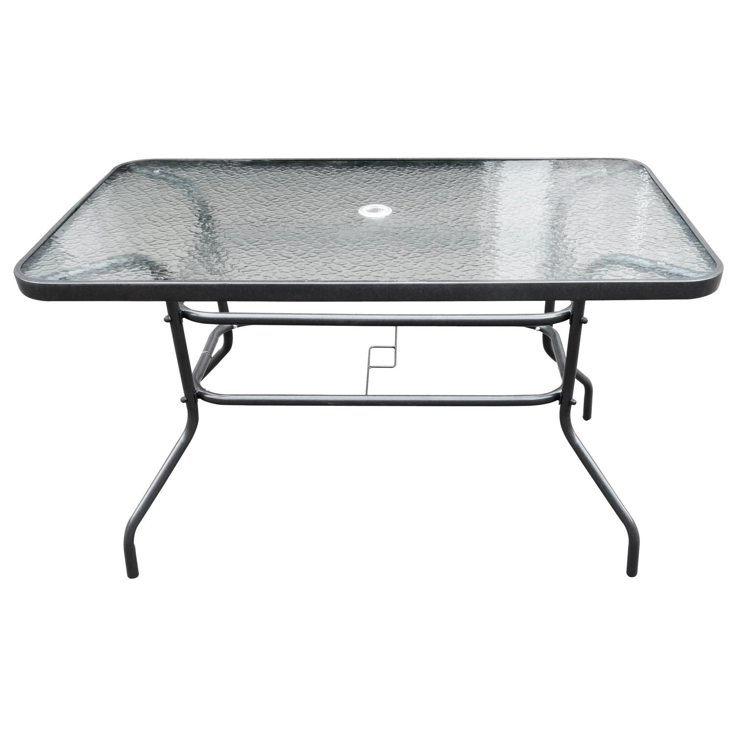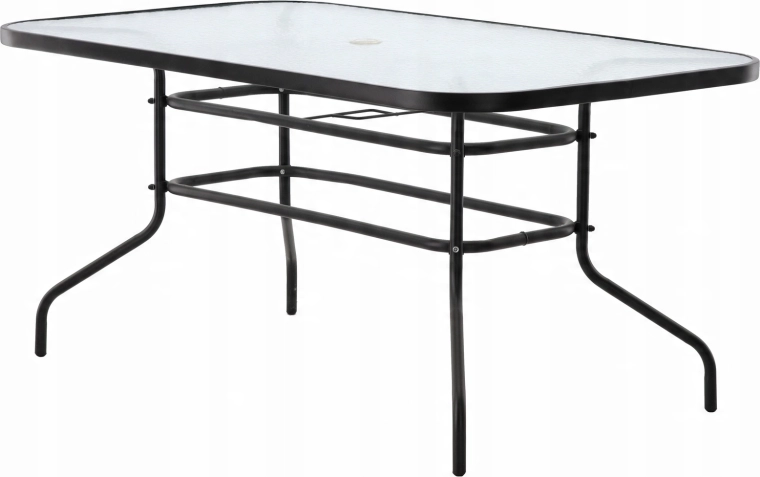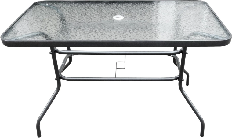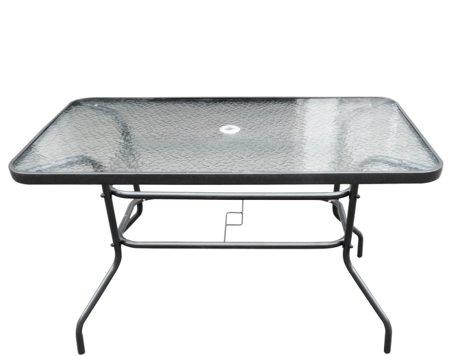 Tento obdélníkový zahradní stůl kombinuje odolnou ocelovou konstrukci s bezpečným hartovaným sklem o tloušťce 5 mm. Texturovaný povrch skla působí elegantně a zároveň je praktický na údržbu. Uprostřed desky je uzavíratelný otvor (Ø 48 mm) pro slunečník, který zajistí příjemný stín během slunečných dnů.