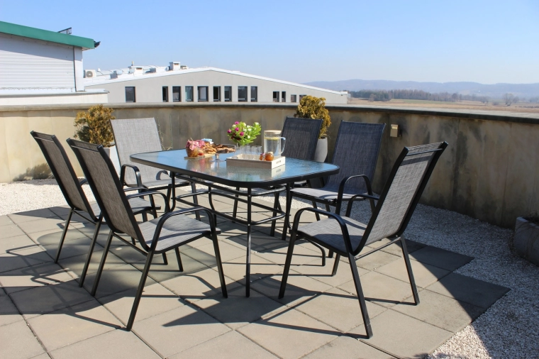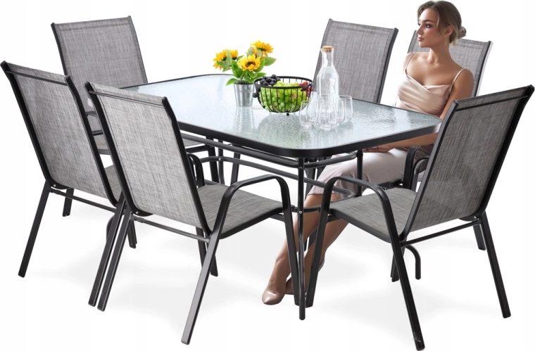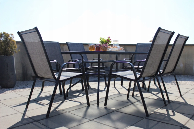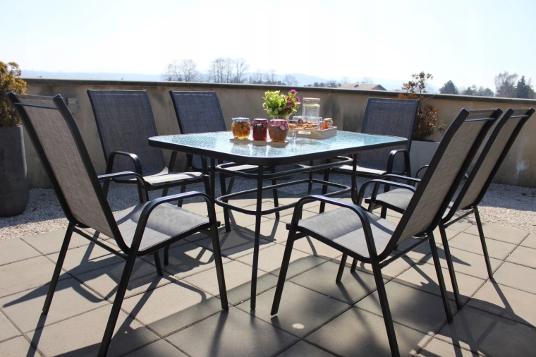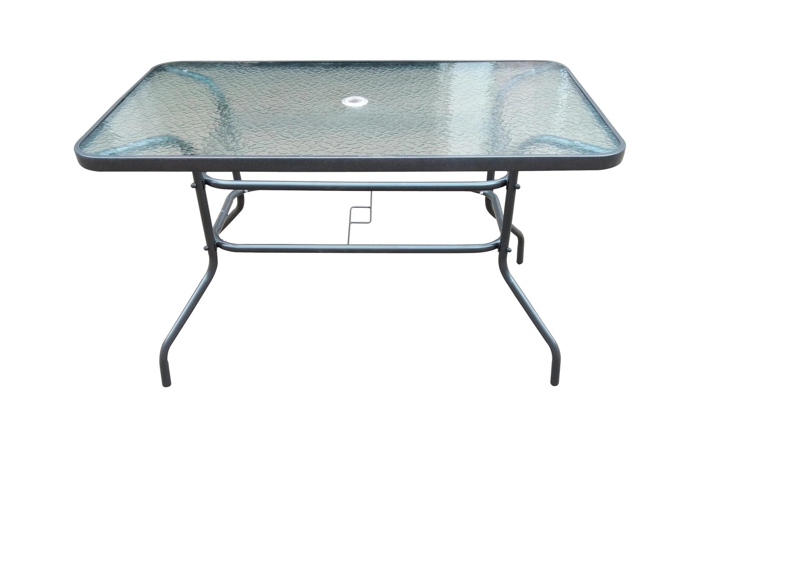 Tento obdélníkový zahradní stůl kombinuje odolnou ocelovou konstrukci s bezpečným hartovaným sklem o tloušťce 5 mm. Texturovaný povrch skla působí elegantně a zároveň je praktický na údržbu. Uprostřed desky je uzavíratelný otvor (Ø 48 mm) pro slunečník, který zajistí příjemný stín během slunečných dnů.