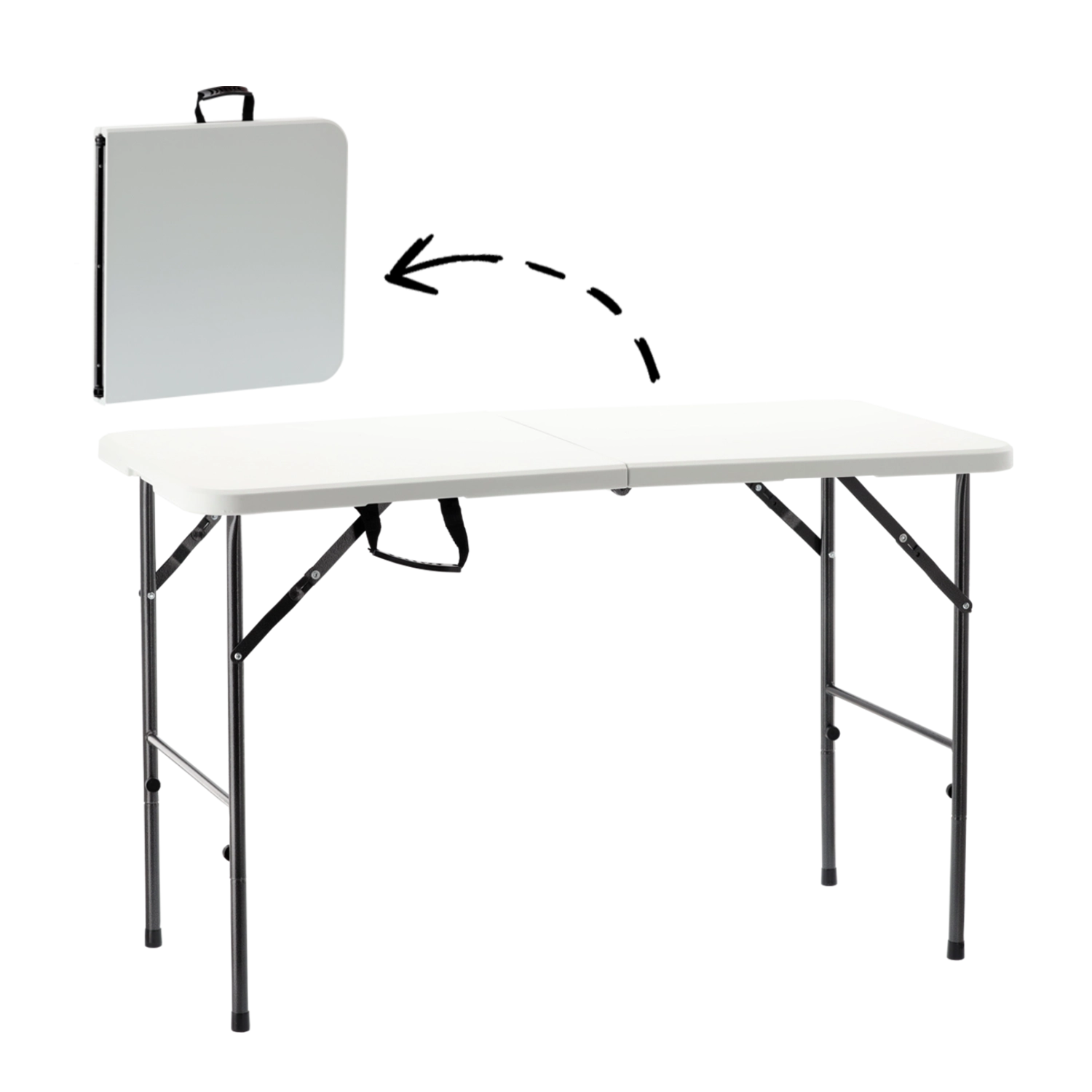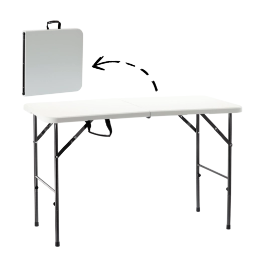 Univerzální skládací stůl 120 × 60 × 74 cm je ideální pro rodinné oslavy, grilování, kempování i promo akce. Odolná deska z HDPE a pevný ocelový rám se zámkem zajišťují vysokou stabilitu a dlouhou životnost při použití v interiéru i exteriéru.