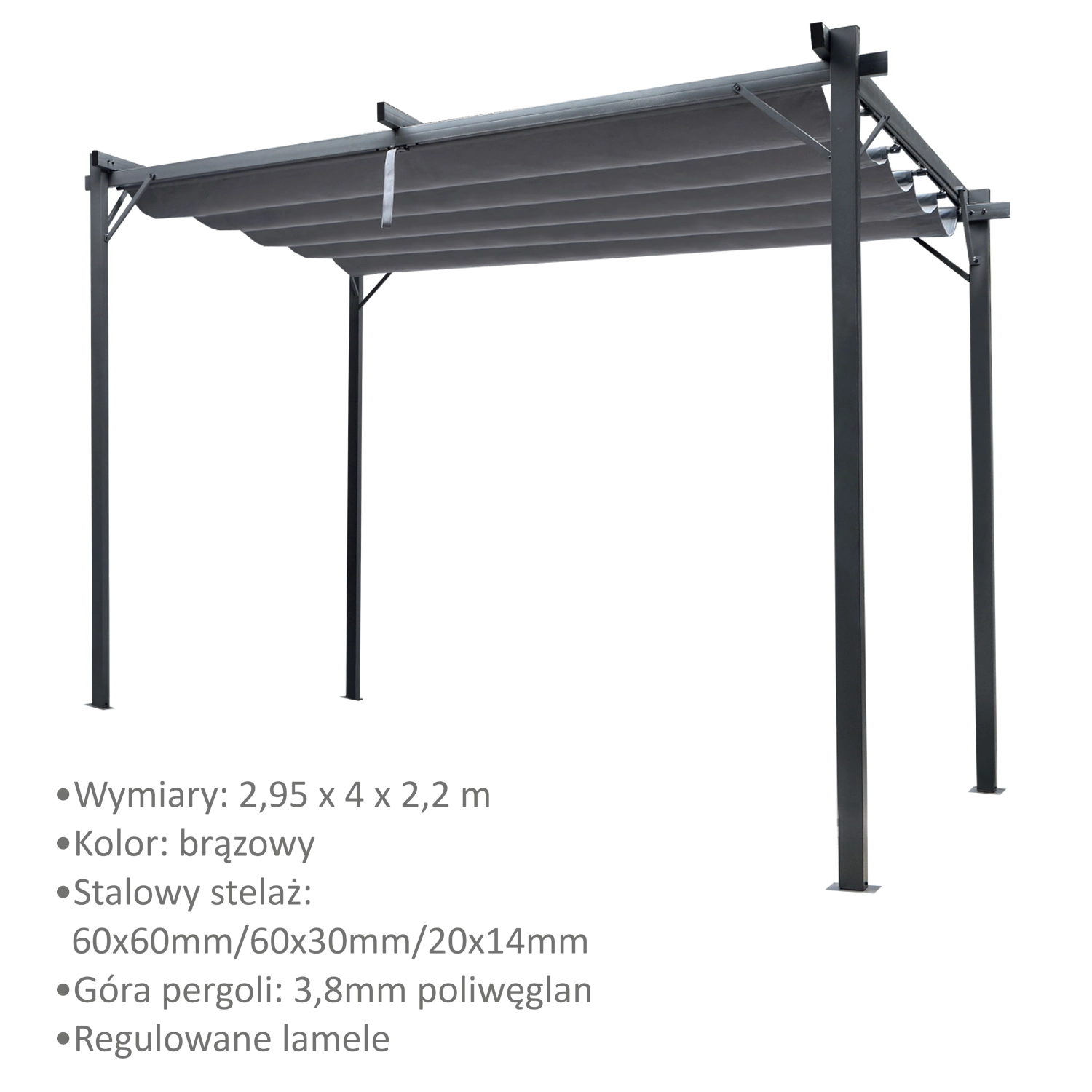 Elegantní zahradní pergola 3 × 4 m se stabilní ocelovou konstrukcí a posuvnou střechou z hustého polyesteru 300 g/m² přinese na vaši terasu příjemný stín i ochranu před lehkým deštěm. Antikorozní rám s práškovým lakem zajistí dlouhou životnost a rychlá montáž do 30 minut potěší každého, kdo chce okamžitě relaxovat venku. Pro bezpečné používání je nutné pevné ukotvení k podkladu.