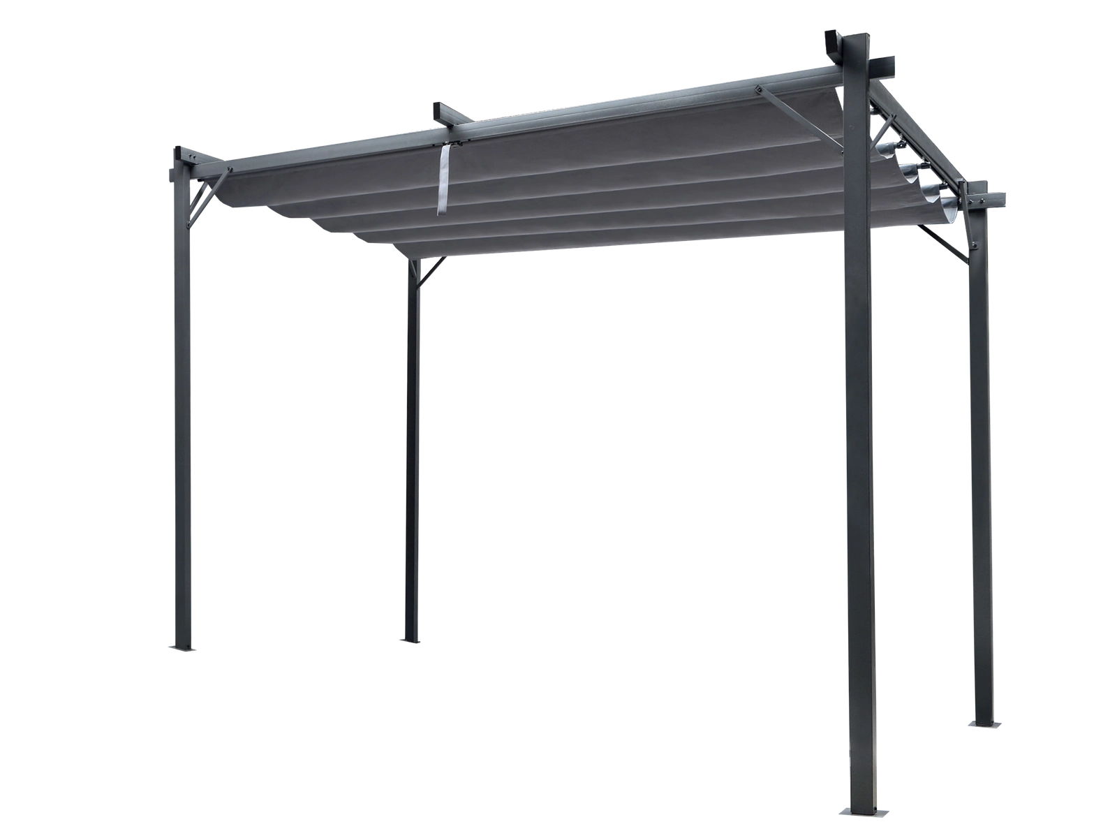 Robustní ocelový rám s práškovým lakováním odolává korozi a zajišťuje stabilitu celé konstrukce. Potah z 100% polyesteru, 300 g/m², je odolný a snadný na údržbu. Montáž je intuitivní a zvládnete ji zhruba za 30 minut. Pro maximální stabilitu doporučujeme pergolu pevně kotvit k podkladu.
