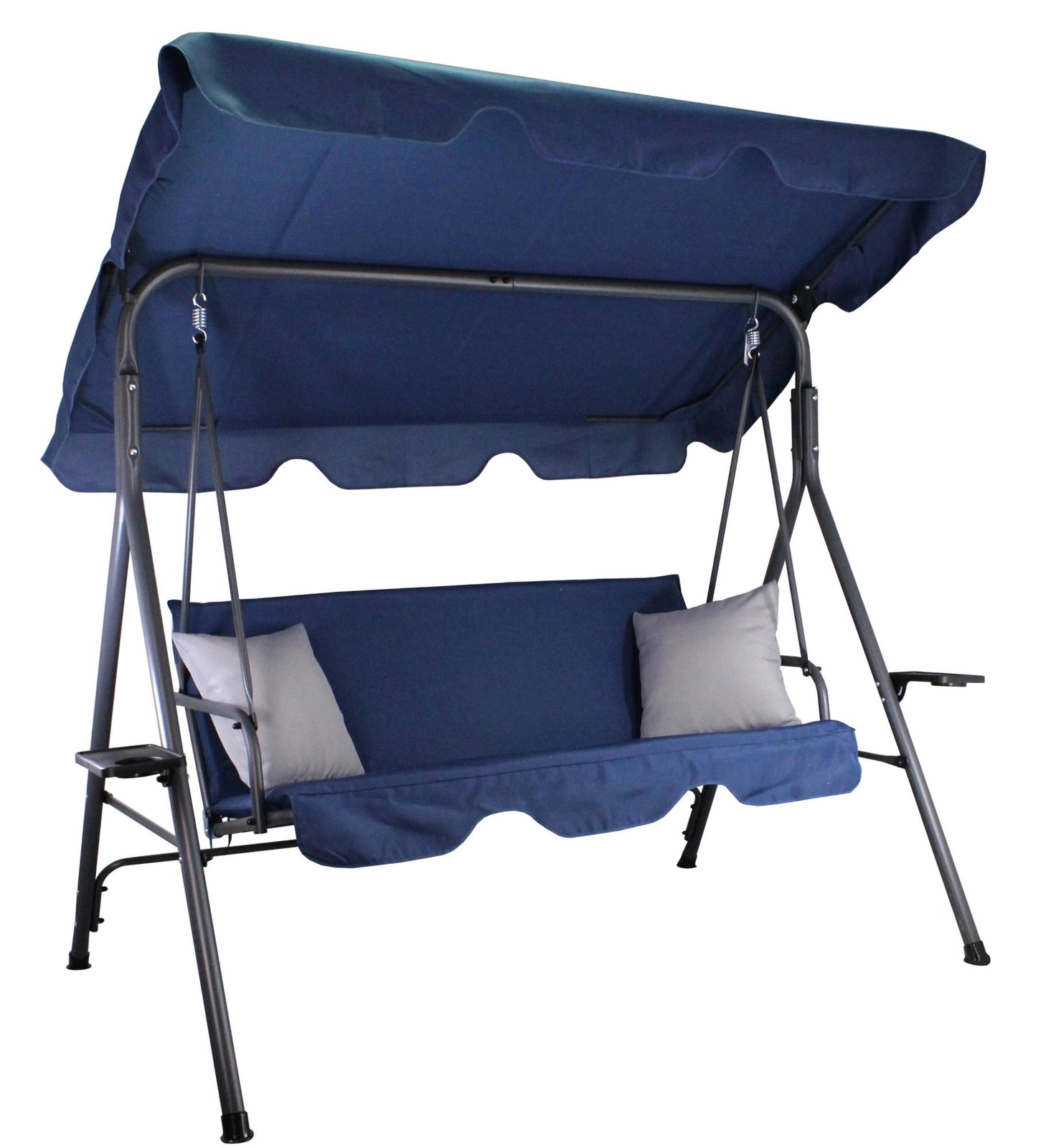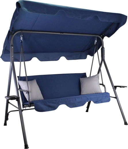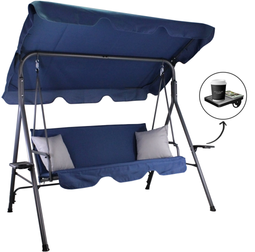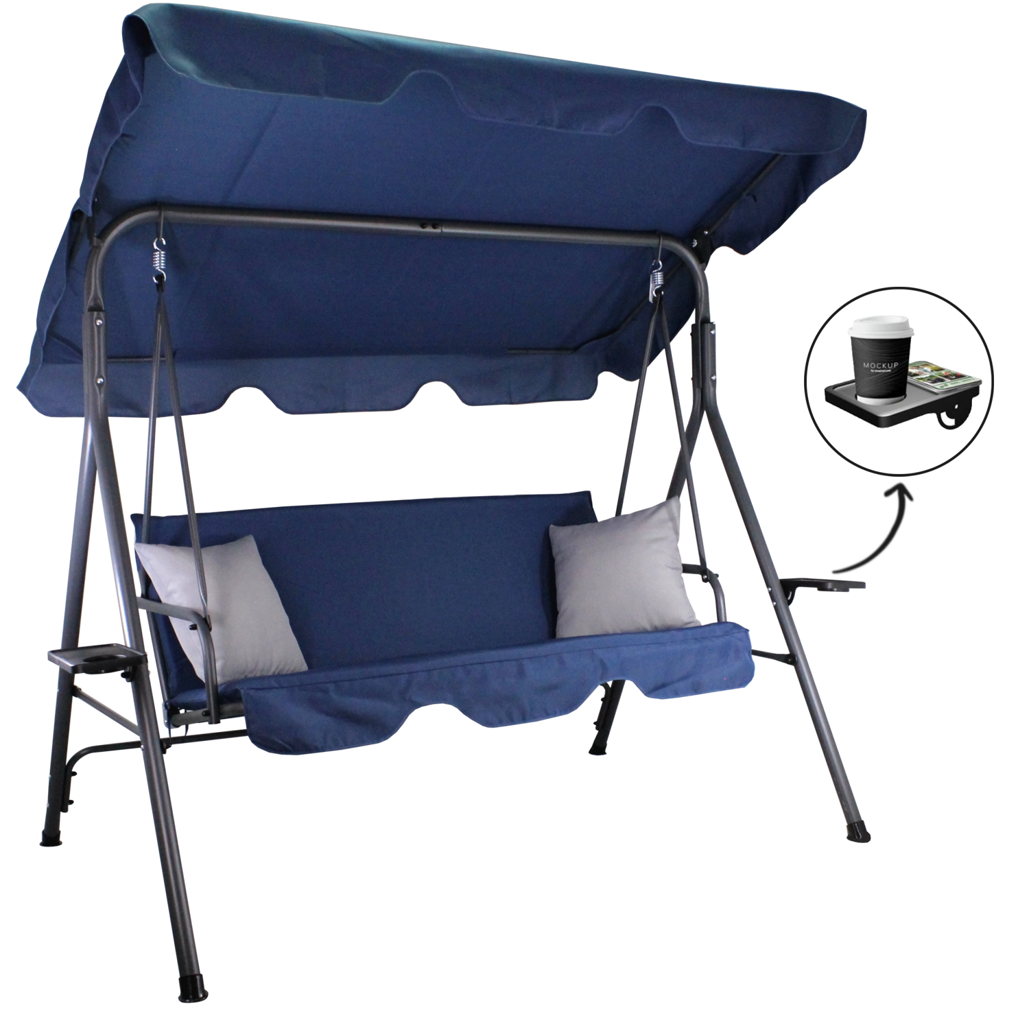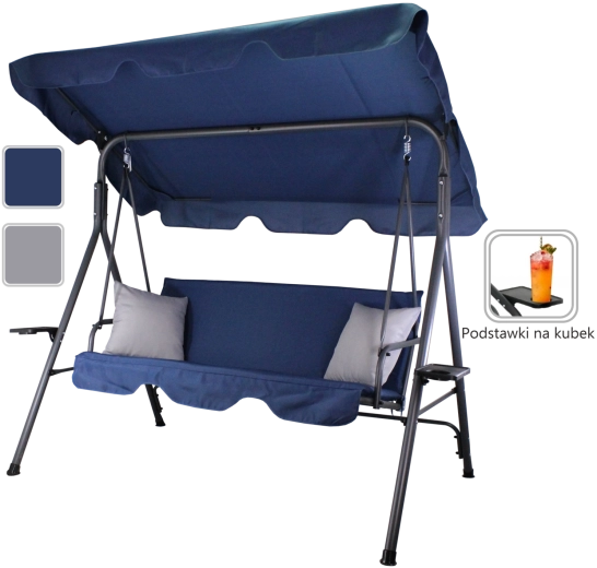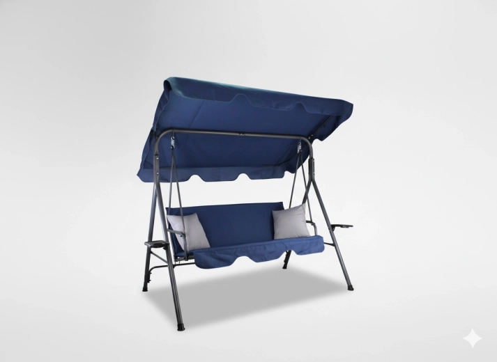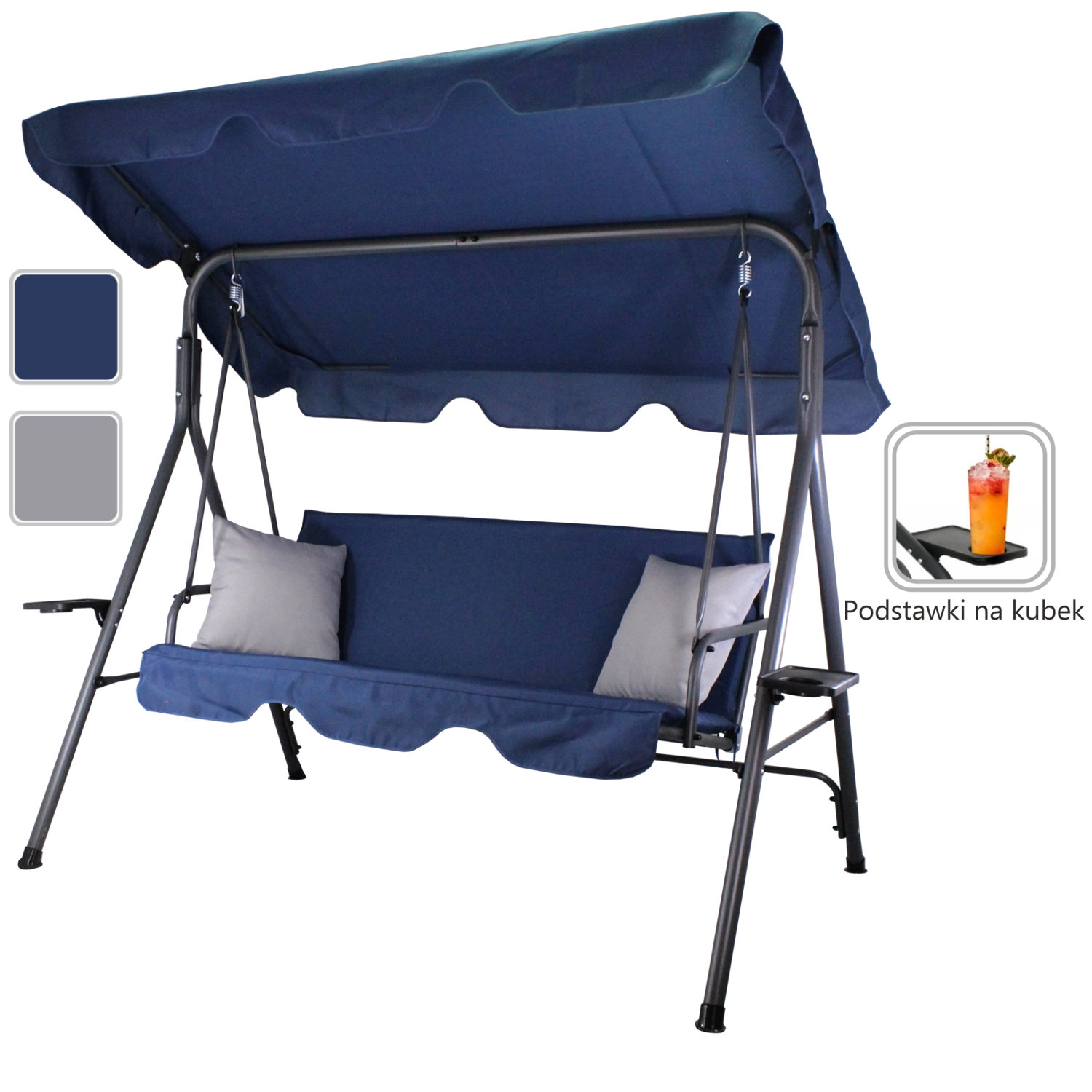 Užijte si pohodový odpočinek na zahradě se stylovou houpačkou A‑Type v elegantní tmavě modré barvě se šedými polštáři. Nabízí pevnou ocelovou konstrukci, nastavitelnou stříšku proti slunci a praktické držáky na nápoje po stranách. Ideální pro 2–3 osoby, skvěle zapadne na terasu i zahradu.